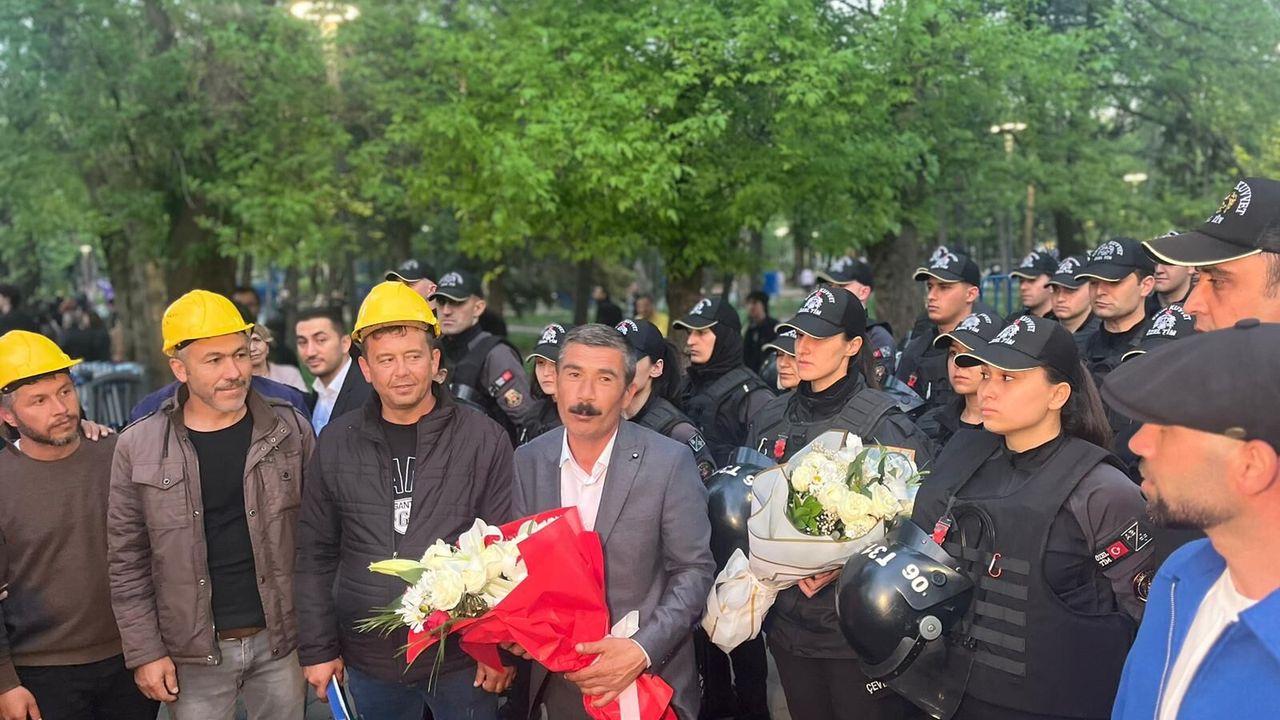 MADEN İŞÇİLERİNDEN POLİSLERE ÇİÇEK