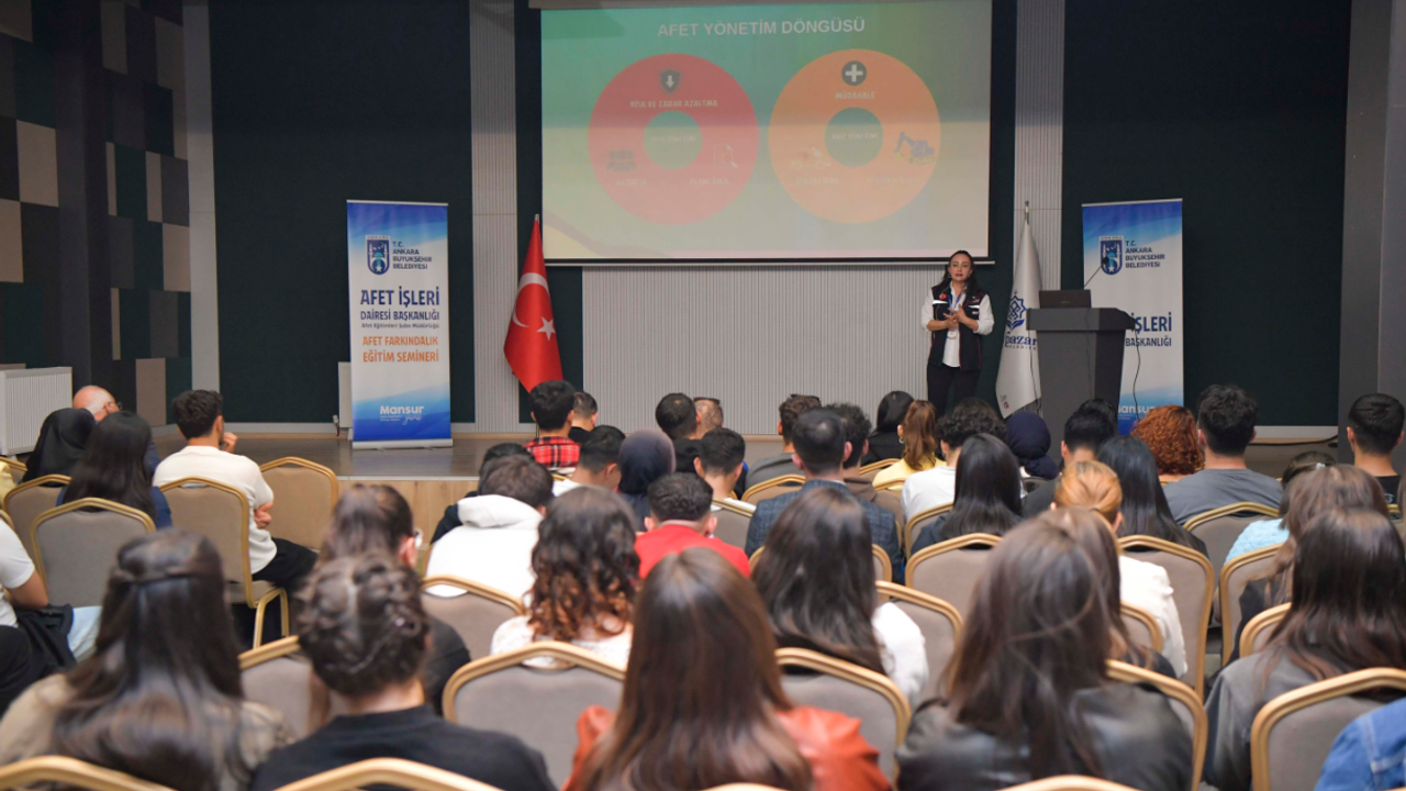 Ankara Büyükşehir Belediyesi (ABB), afetlere karşı bilinçli ve hazırlıklı bir toplum oluşturmak amacıyla sürdürdüğü Afet Farkındalık Eğitimlerine devam ediyor. Beypazarı Konferans Salonu’nda düzenlenen Afet Farkındalık Eğitim Semineri’ne ilçe belediye personelleri, mahalle muhtarları ve Ankara Üniversitesi Beypazarı Meslek Yüksekokulu öğrencileri katıldı.