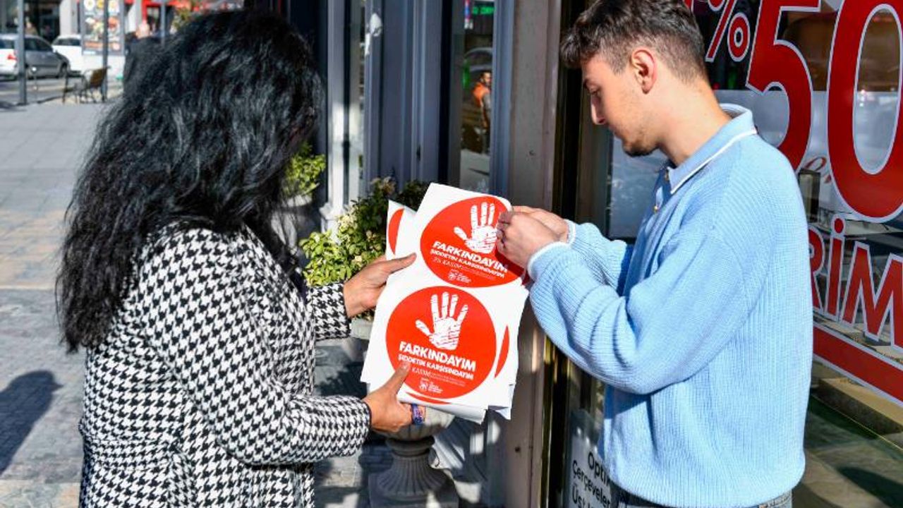 Ayrıca uygun görülen iş yerlerinin girişlerine, farkındalığı görünür kılmak amacıyla “Farkındayım, Şiddetin Karşısındayım” yazılı yapıştırmalar (stickerlar) asıldı.