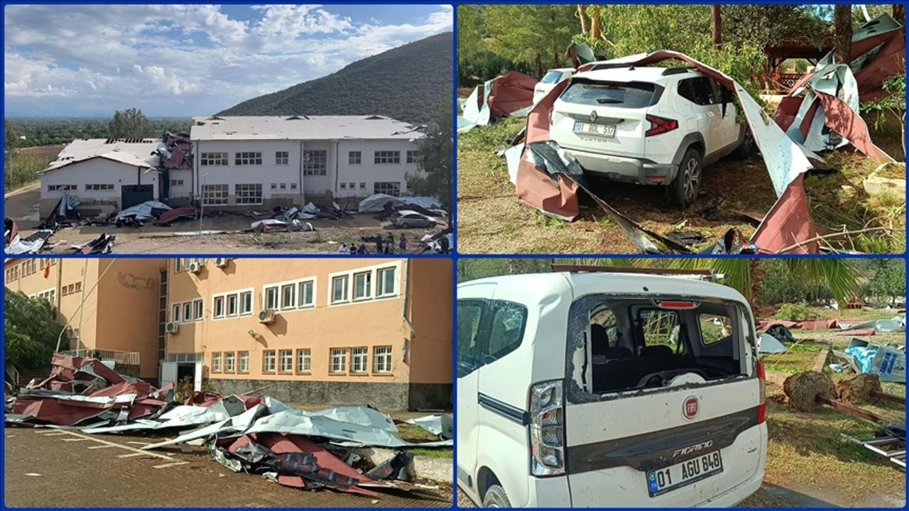 Bucak Mahallesi'ndeki Kozan Bucak Çok Programlı Anadolu Lisesi'nin güvenlik kamerasınca kaydedilen görüntüde, dün ilçede etkili olan fırtınada derslik ve atölye binalarının çatılarının uçtuğu görülüyor.