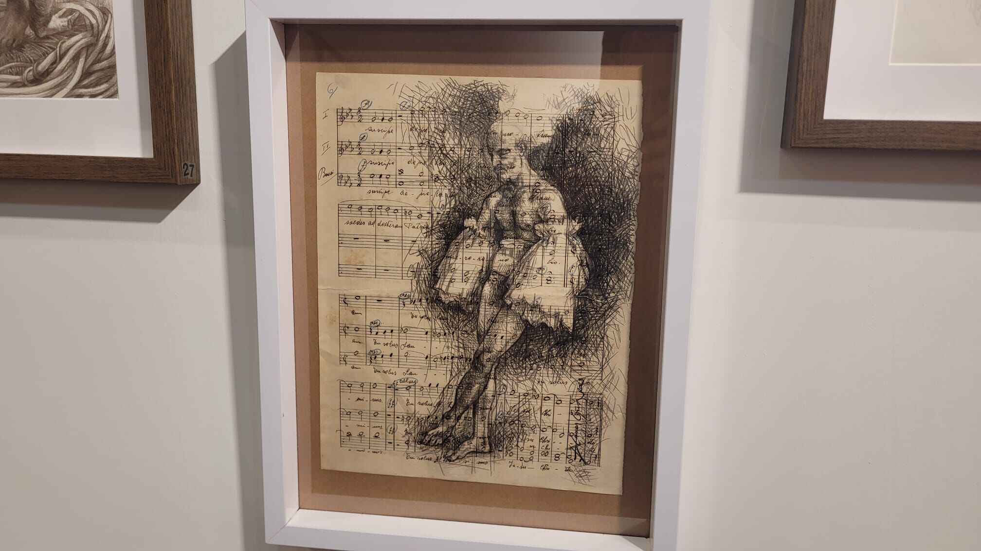 Yine bir ilginç çalışması ise nota sayfaları üzerine. 1930’lara ait Ermeni Katolik Cemaatine ait bir İtalyan bestecinin nota eserinin sayfaları üzerine de bir çalışma dikkat çekiyor. Sanatçı Ataman Oğuz, nota kitabıyla ilgili olarak “Biri ölünce onun terekesini almış. Satın alan kişi bana hediye etti nota defterini bende o defteri değerlendirdim. Ressam "her şeyi resim yapacak yüzey olarak görüyorum” anlatımı ile vurguluyor.