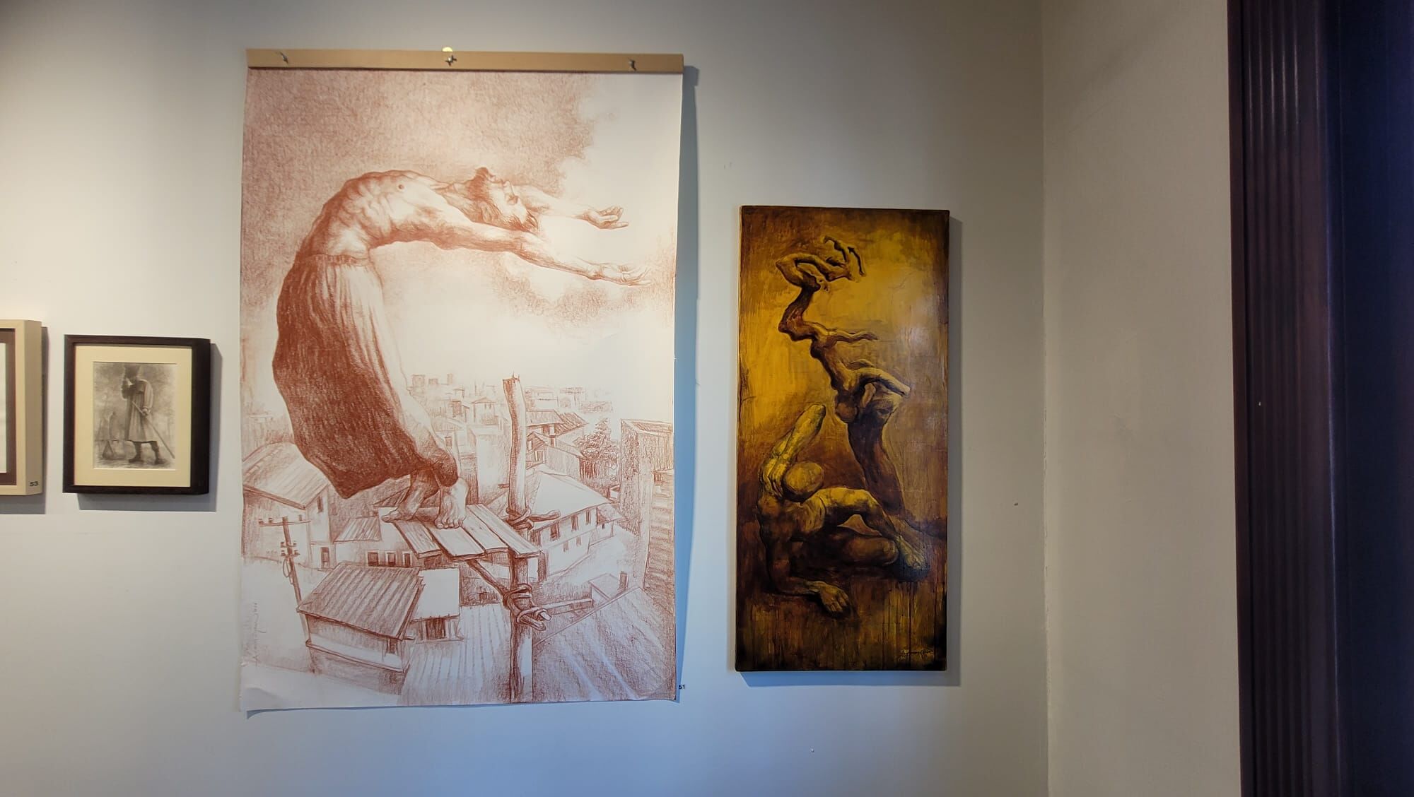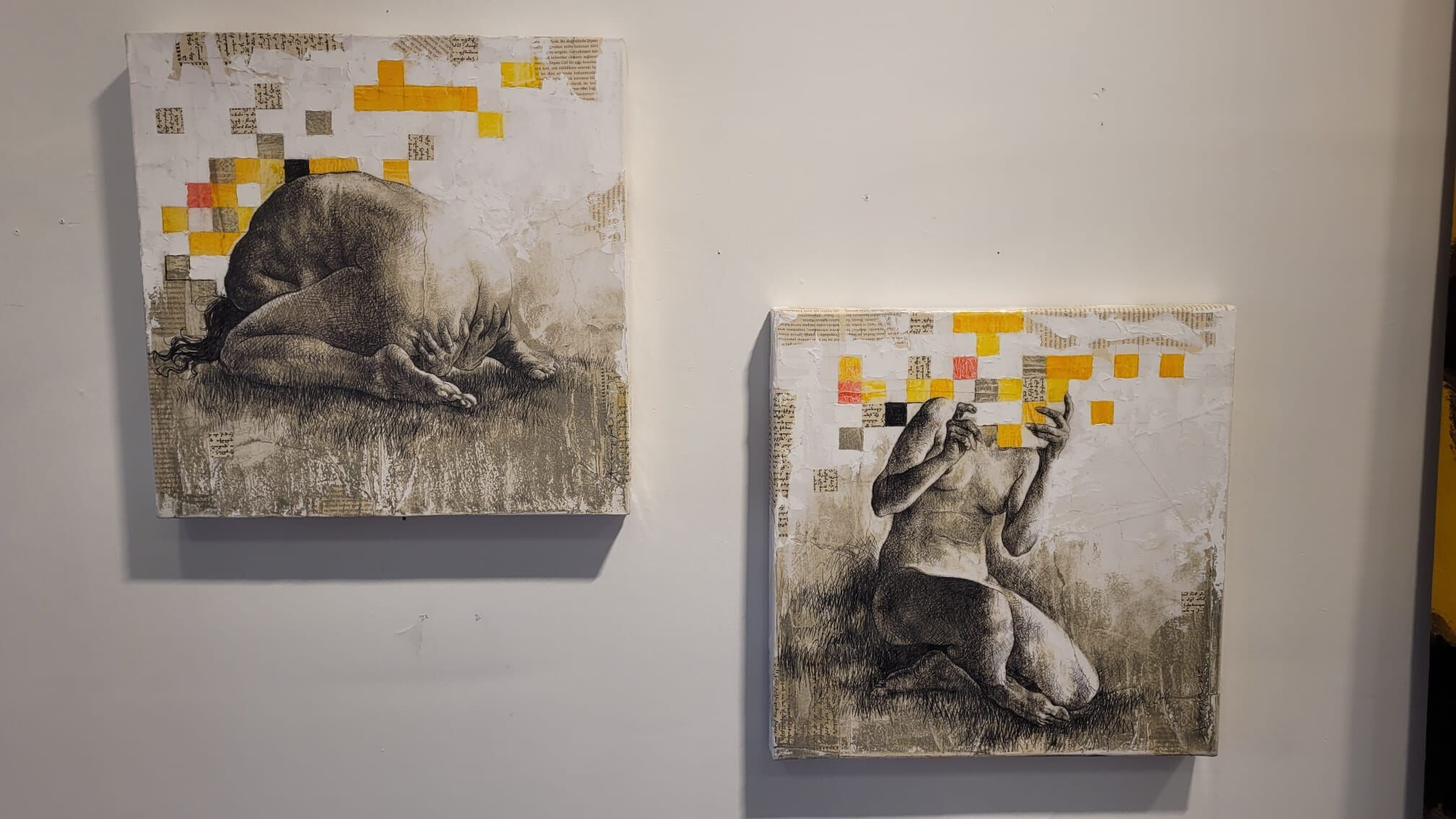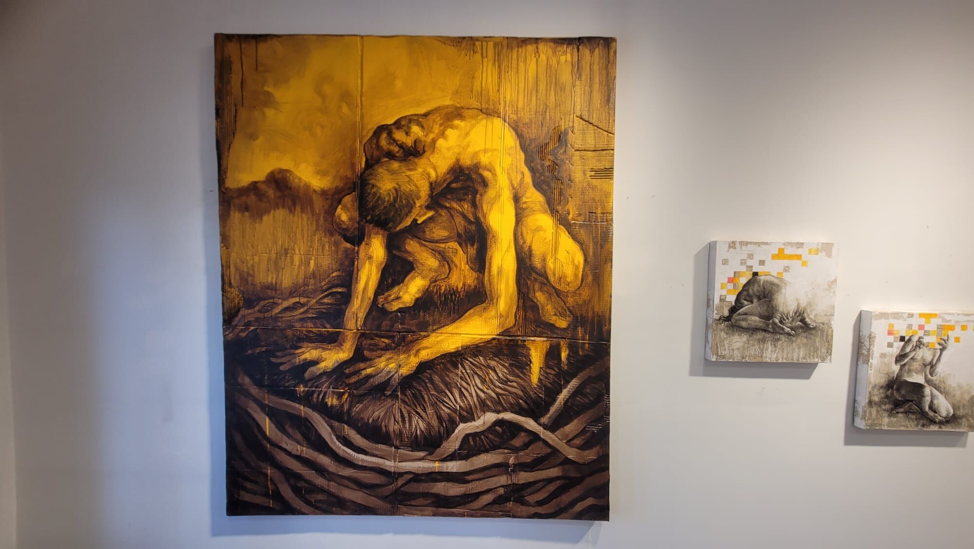 Sanatçı Ataman Oğuz’un birbirinden ilginç çalışmalarını da sergide görme imkanı var. Bunlardan birinde Latince el yapımı diyanizos kültürü yunan mitolojisinin Hristiyanlığı nasıl etkilediğini anlatan 16. yüzyıldan kalma ciddi bir teolojik kitabın sayfaları üzerine de kontraposto çalışmasını görebiliyorsunuz. Sanatçı Oğuz, kitap sayfaları ile ilgili “Güzel tarafı Google da çevirip okuyabiliyorsunuz, bu sebeple yazılar gizemli değil. Ben eski olan her şeyi çok seviyorum ve kitaplardan kolajlar yapmaya "bilginin enkarnasyonu" diyorum. Benden önceki her şeyi selamlama biçimim. O yüzden kitaplardan pasajlar, tuvallerde kolajlarla bunları kullanmayı severim” sözleriyle çalışmalarındaki teknikleri anlatıyor.