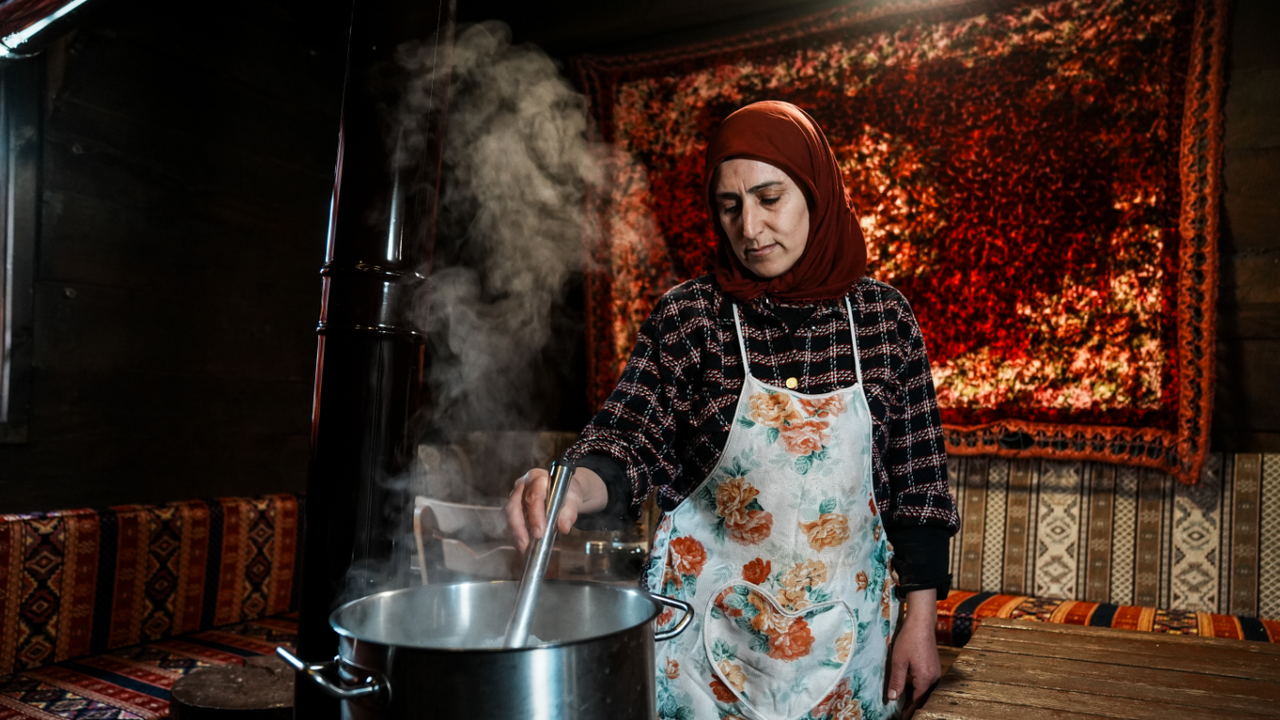 Sert yapısıyla bilinen salep bitkisi toz haline getirilip taze sütle buluşturulduktan sonra bir sobanın üzerinde yer alan kazanda aralıksız kaynatılıp karıştırılıyor.