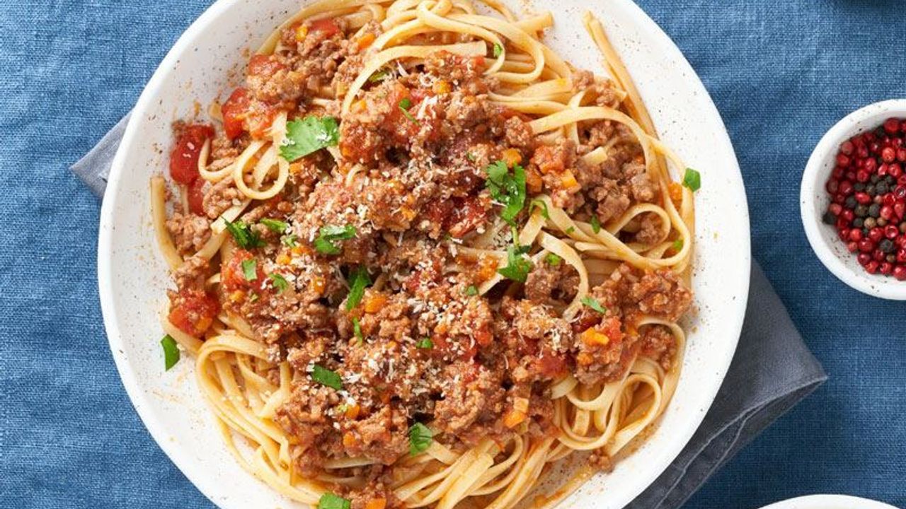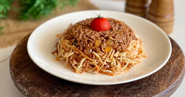 Haşlanan erişteleri servis tabağına alın, üzerine kıymayı ekleyin.