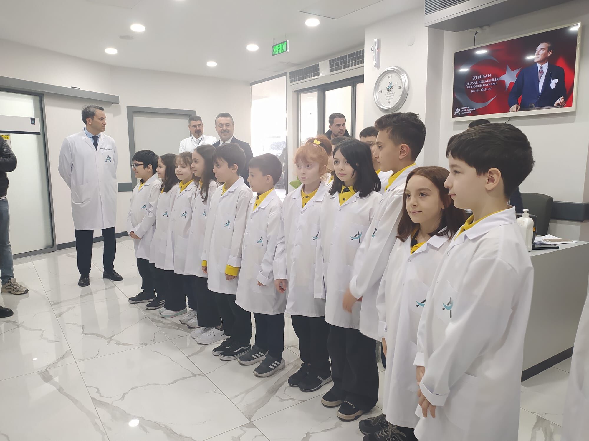 14 Nisan’da yenilenen yüzüyle kapılarını açan Ankara Uluslararası Hastanesi, 23 Nisan kutlamaları kapsamında anlamlı bir projeye imza attı. Keçiören’deki bir okuldan gelen 15 İlkokul Öğrencisi, okul müdürü Metin Bardakçı ve öğretmenleri eşliğinde hastane kapısında güler yüzle karşılandı. Etkinlik kapsamında çocuklara ilk olarak kendi boylarına uygun hazırlanan Doktor Önlükleri giydirildi. Önlüklerini giyip hastane koridorlarında birer "Doktor Adayı" olarak yerlerini alan İlkokul Çocukları, iki saati aşkın süre boyunca Hastanenin tüm birimlerini keşfetti.