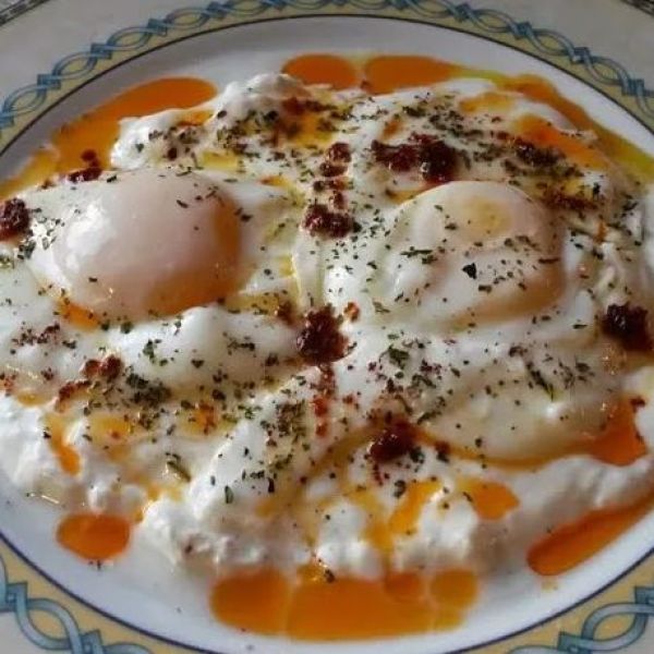 · Pişen yumurtaları kaşık yardımıyla yoğurdun üzerine yerleştirin.