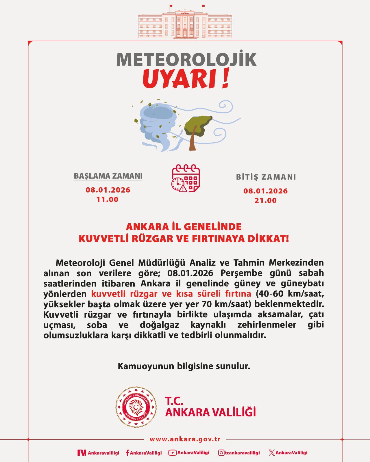 Valilikten yapılan açıklamada, Meteoroloji Genel Müdürlüğü Analiz ve Tahmin Merkezinden alınan son verilere göre, yarın sabah saatlerinden itibaren Ankara il genelinde rüzgarın güney ve güneybatı yönlerden kuvvetli rüzgar ve kısa süreli fırtına (40-60 km/saat, yüksekler başta olmak üzere yer yer 70 km/saat) şeklinde eseceğinin tahmin edildiği belirtildi.