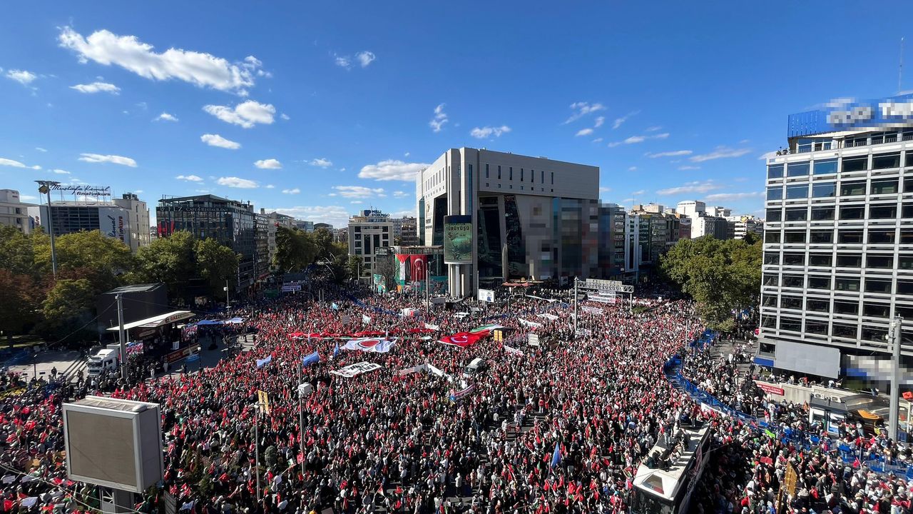 İçişleri Bakanı Ali Yerlikaya, Ankara'da gerçekleştirilen 'Gazze Kararlılık Yürüyüşü'ne ilişkin sosyal medya hesabından yaptığı açıklamada, "Bugün Ankara'da 300 bin vicdan yerinden doğrulup ayağa kalktı. ANFİDAP'ın çağrısıyla; sendikalar, vakıflar, dernekler, gençler, anneler, esnaflar, 'Gazze Kararlılık Yürüyüşü'nde, her daim zalimin karşısında kıyam eden koskoca bir millet omuz omuza yürüdü. Melike Hatun'dan yükselen o ses, insanlığın ortak vicdanının sesine ses oldu" ifadelerini kullandı.