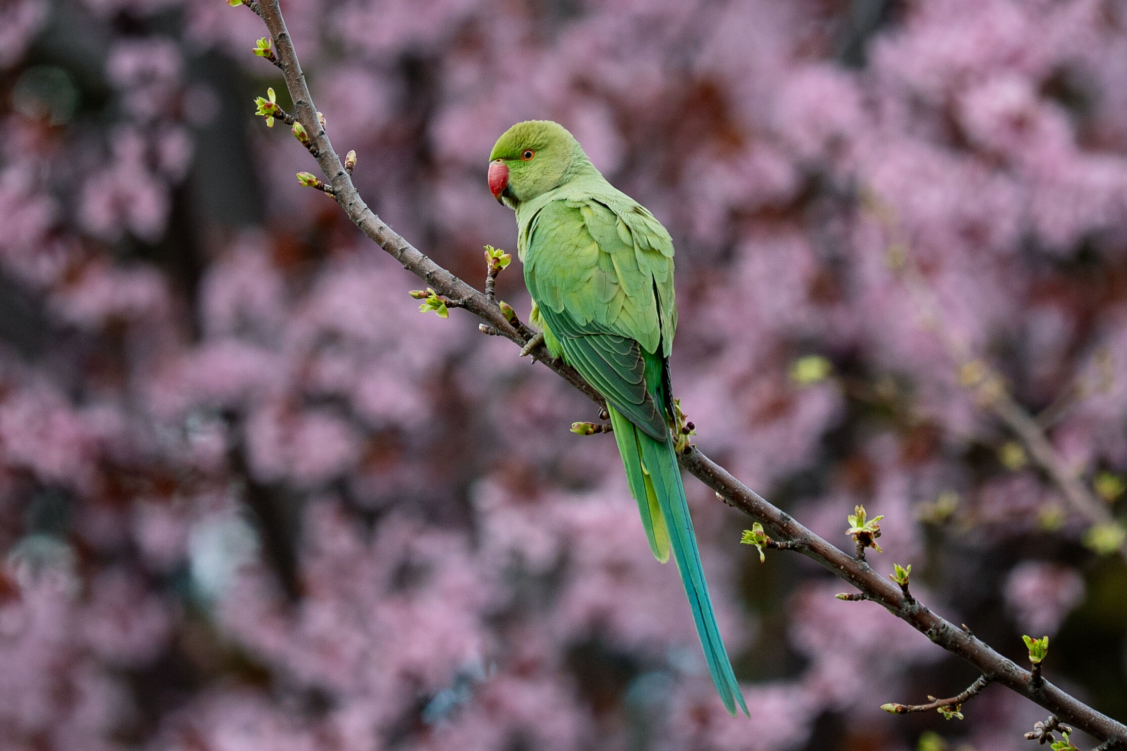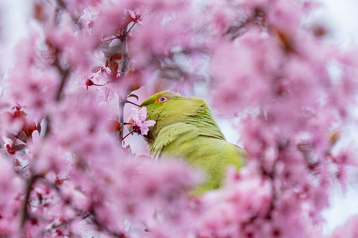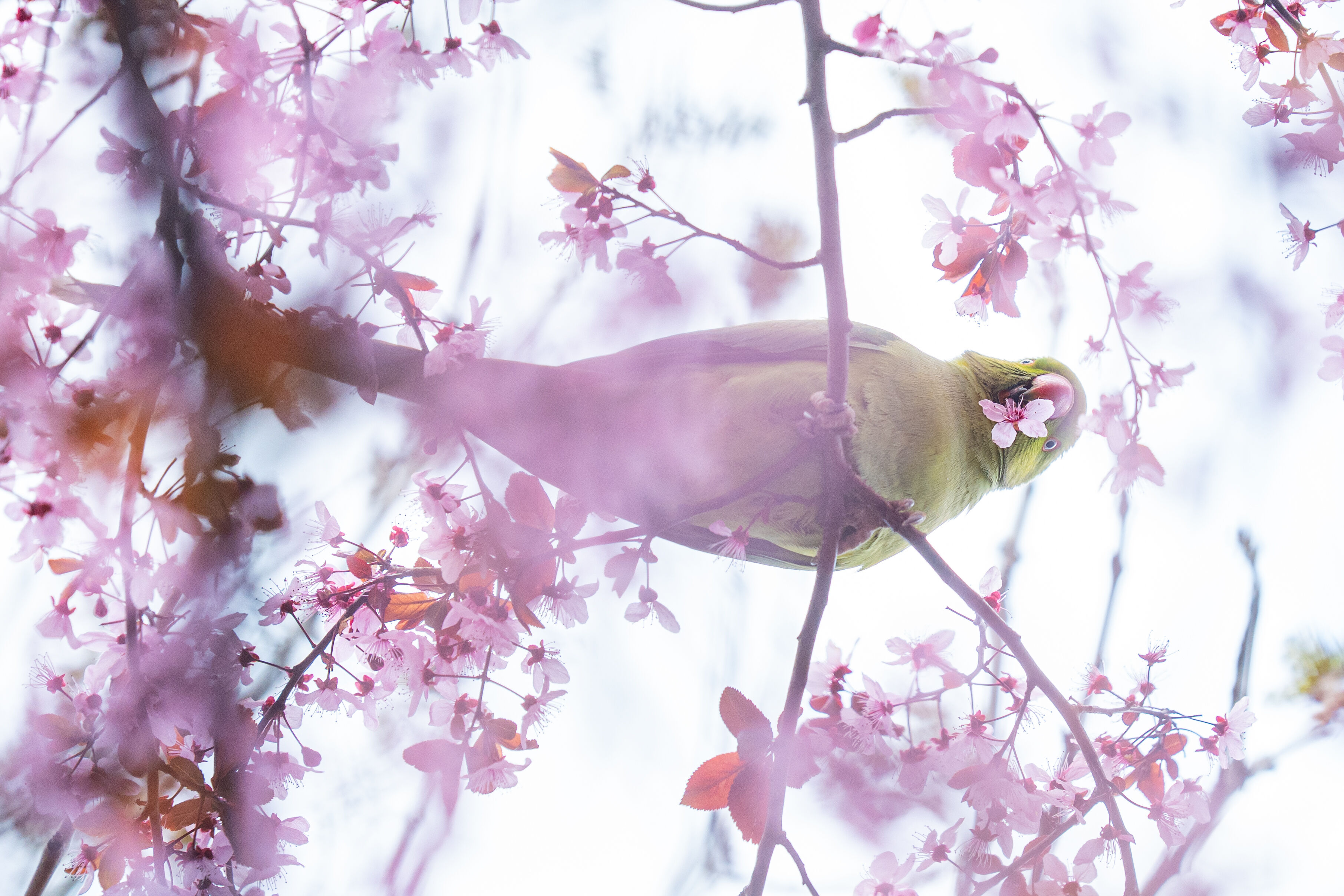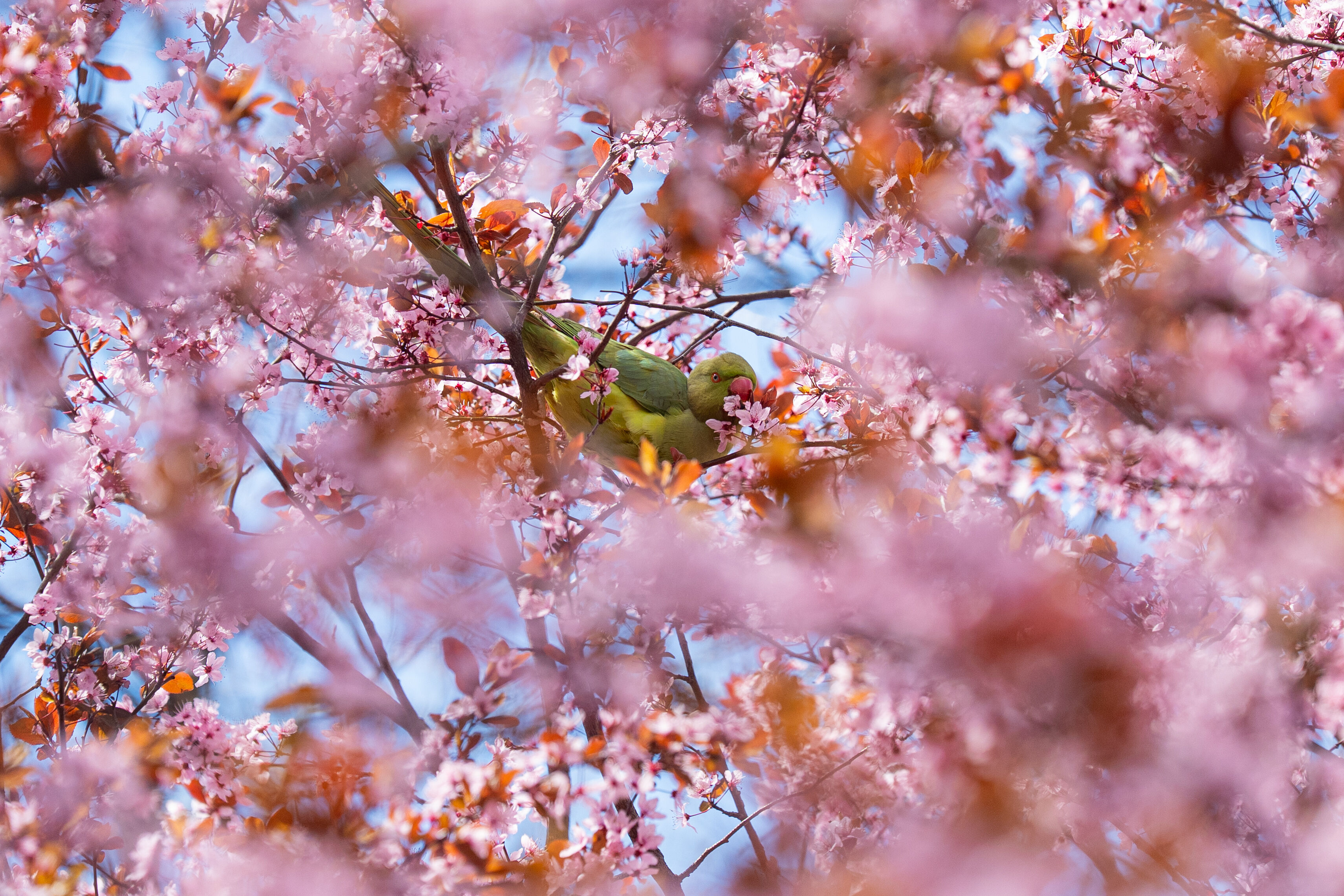 Doğal yaşam alanları Afrika ile Güney Asya olan ve anavatanları dışında popülasyonunu artırarak yerleşik bir tür haline gelen yeşil papağanlar (Psittacula Krameri), Ankara Gençlik Parkı'nda havaların ısınmasıyla açan meyve ağacı çiçekleriyle beslenirken görüntülendi.