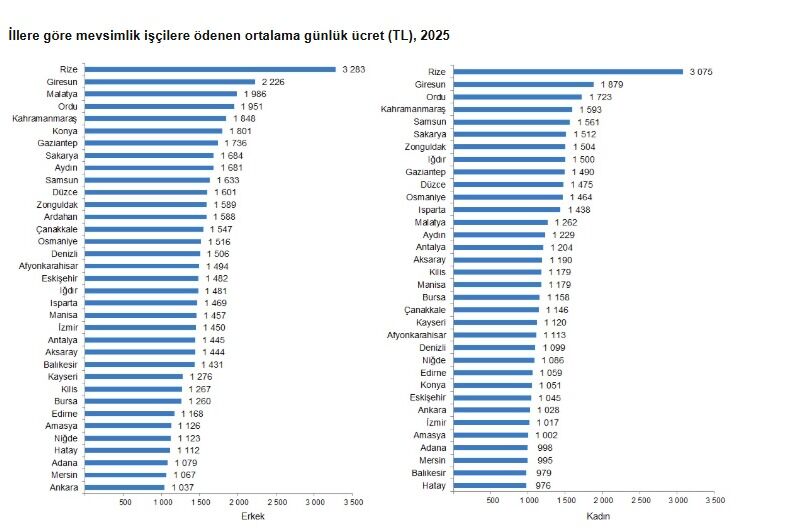 Tarımsal işletmelerde 2025 yılında mevsimlik tarım işçilerine yapılan en yüksek günlük ücret ödemesi erkek işçiler için 3 bin 283 TL, kadın işçiler için 3 bin 75 TL ile Rize’de gerçekleşti. En düşük ücret ise erkek işçilerde 1.037 TL ile Ankara’da, kadın işçilerde 976 TL ile Hatay’da kaydedildi.