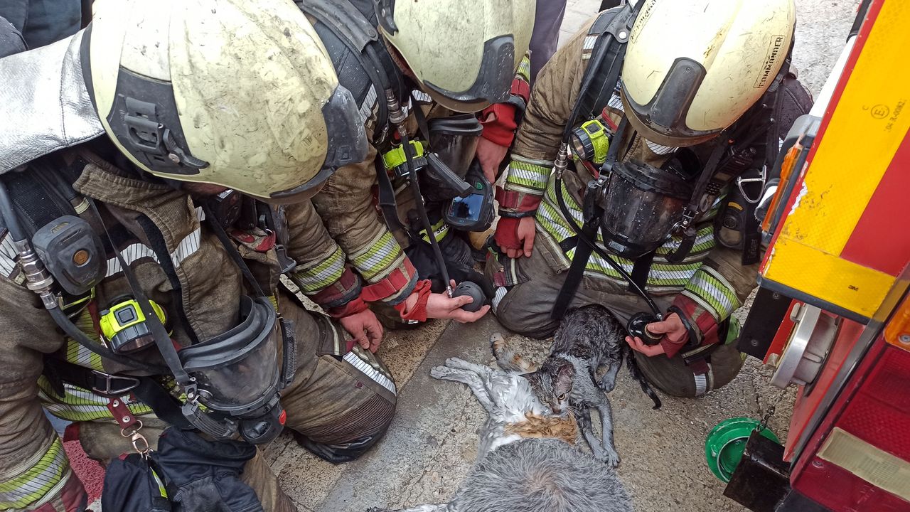 Dumandan etkilenen Paytak ve Şanslı isimli kedilere sağlık ekipleri kalp masajı yaptı, oksijen vererek hayata döndürdü.