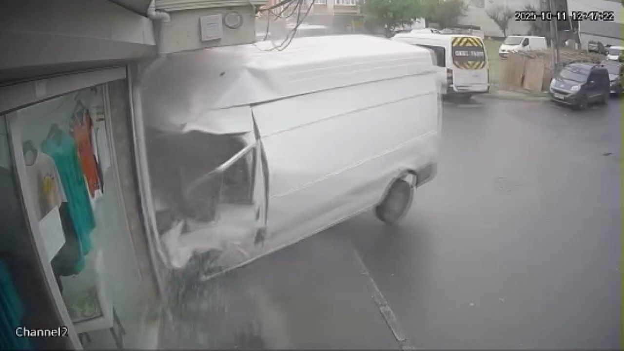 Kaza anı ise bir iş yerinin güvenlik kamerasına saniye saniye yansıdı. Aracın hızla gelip, iş yerine çarpması ve kaldırımda yürüyen bir yayanın minibüsün altında kalmaktan saniyelerle kurtulduğu anlar görüntülerde yer aldı.