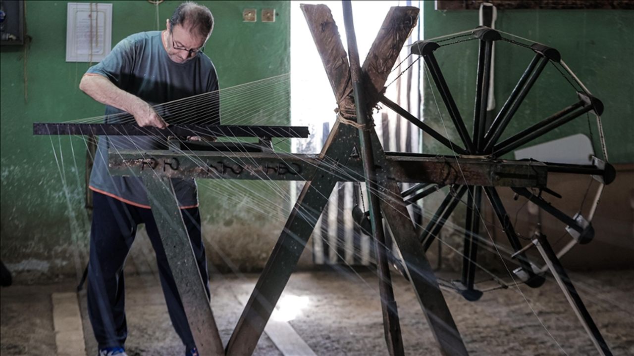 Osmangazi ilçesi Muradiye Mahallesi'ndeki devdahhanesinde, geleneksel yöntemlerle ham ipekten ip hazırlamak için 7 yaşından beri çalışan Şengünalp, her gün 6 saatlik mesaisinde ortalama 20 kilometre koşuyor.