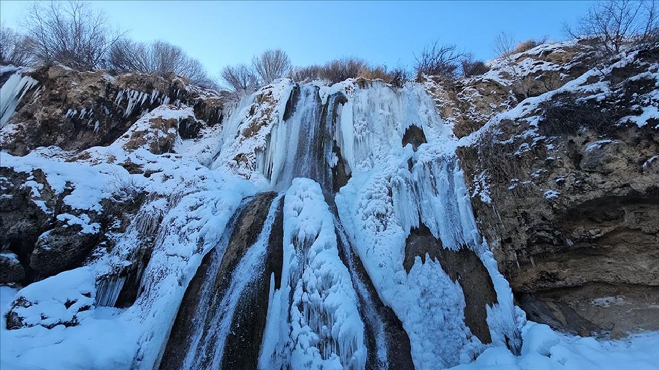 Uzun buz sarkıtlarının oluştuğu şelale, ziyaretçilerini kış güzelliğiyle ağırlıyor.
