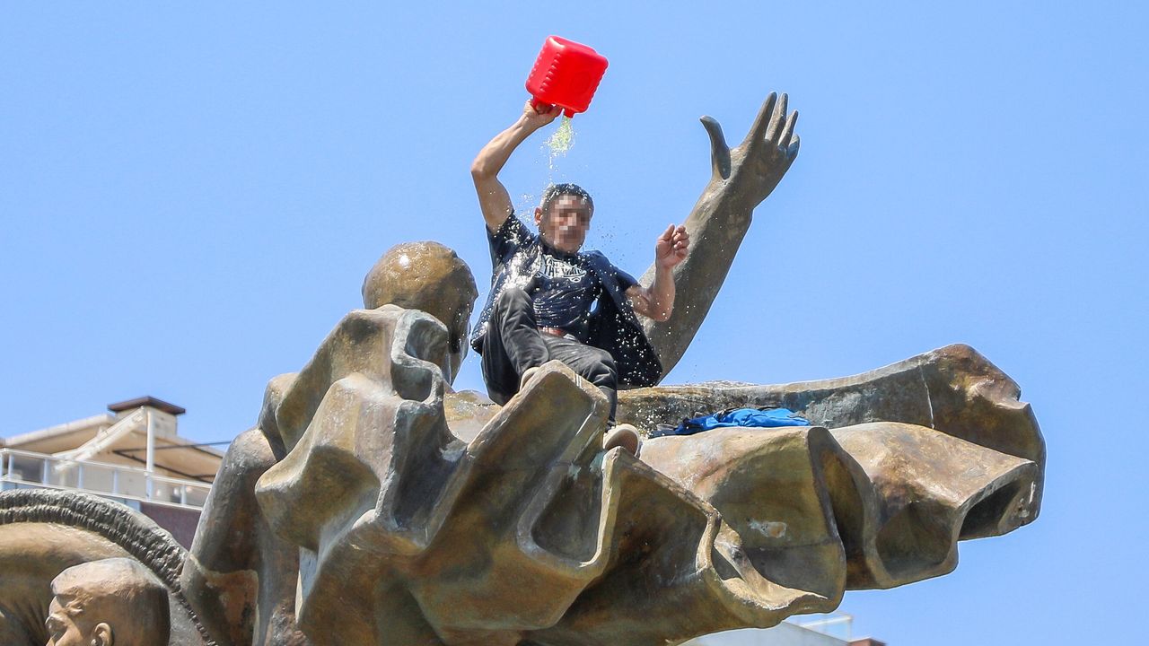 Bir yandan içki içmeye devam eden Ertan Ö., yine kendisini yakacağını söyleyerek, bidondan üzerine benzin dökmeye başladı. Anıtın üzerinde bekleyişini sürdüren ve zaman zaman elindeki benzin bidonuyla tehditler savuran Ertan Ö.'yü ikna etmek için polis ekipleri yoğun çaba sarf etti. Bu sırada kenti gezen turist kafileleri de olanları meraklı gözlerle izledi, bazıları o anlar cep telefonu ile kaydetti.