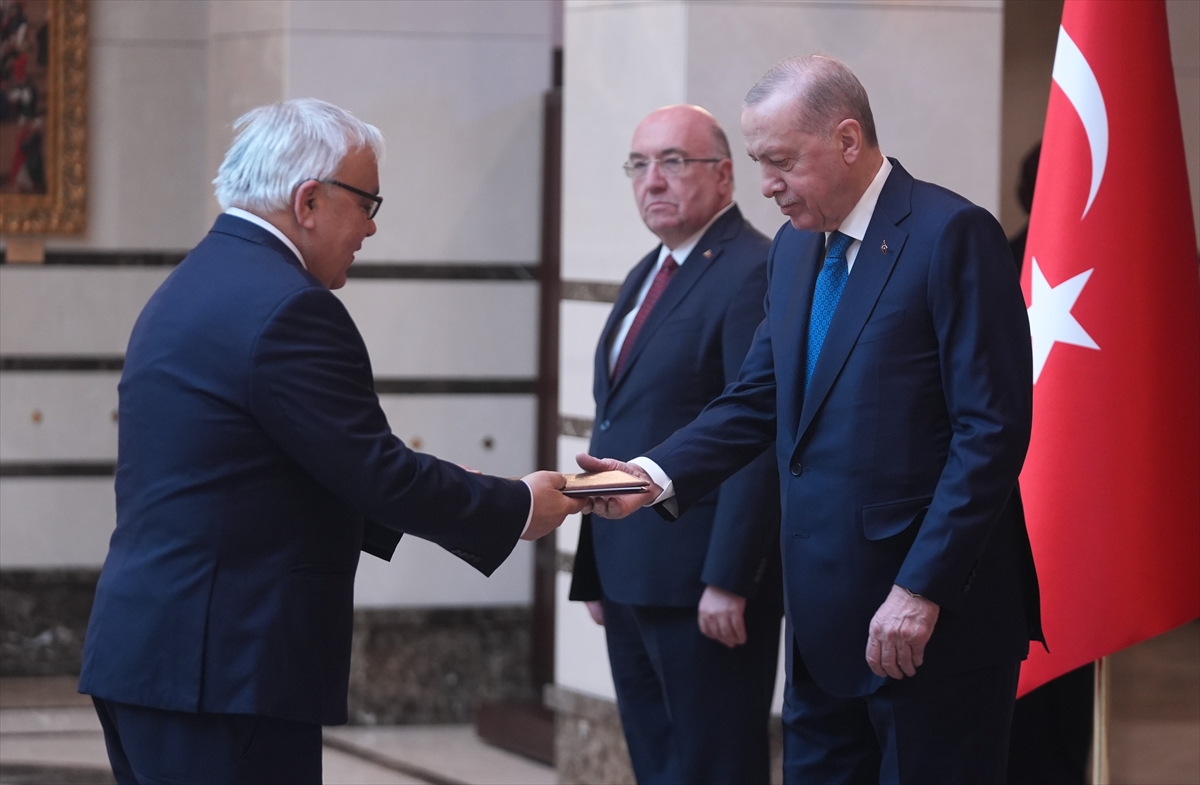 Cumhurbaşkanlığı Külliyesi'ndeki kabulde, Filipinler Büyükelçisi Jamie Ramon Torre Ascalon JR, Kenya Büyükelçisi Anthony Mwaniki Muchiri, Kolombiya Büyükelçisi Yenniffer Edilma Parra Moscoso, Peru Büyükelçisi Luz Betty Caballero Morales ve Rusya Büyükelçisi Sergey Vasilievich Vershinin, Cumhurbaşkanı Erdoğan'a güven mektuplarını sundu.