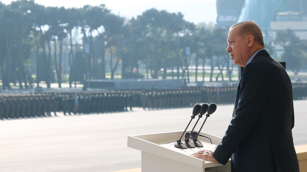 “Karabağ'ın azatlığa kavuşması sadece Azerbaycan için değil, Türk dünyası içinde büyük bir gurur vesilesidir. Azerbaycan ordusunun Karabağ toprağında attığı her adım, istiklal ve izzet uğruna dökülen her damla kan, Türk dünyasının tarihinde birer şeref nişanesi olarak ortak tarihimize altın harflerle yazılmıştır. Bugün burada Azerbaycan askeri Türkiye'den gelen asker kardeşleriyle omuz omuza yan yanalar. Askerlerimize baktıkça iki devlet tek millet şiarının ne demek olduğunu hepimiz görebiliyoruz. Şehitlerimizin birbirine karışan kanlarının üzerinde yükselen hürriyet sancağı, Karabağ'ın dört bir yanında şanla, şerefle, gururla dalgalanıyor.”