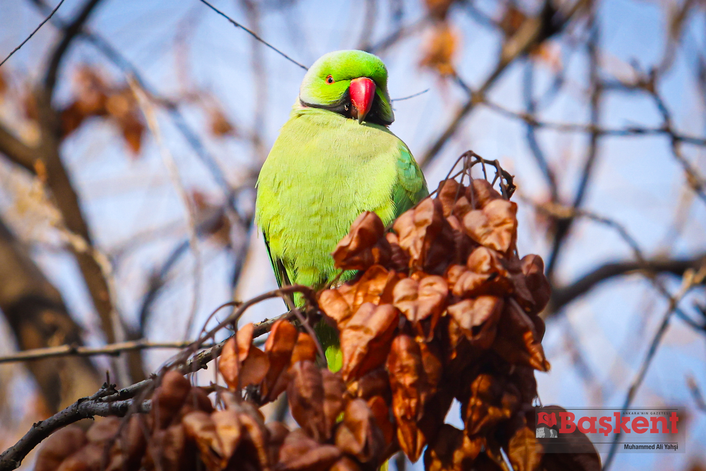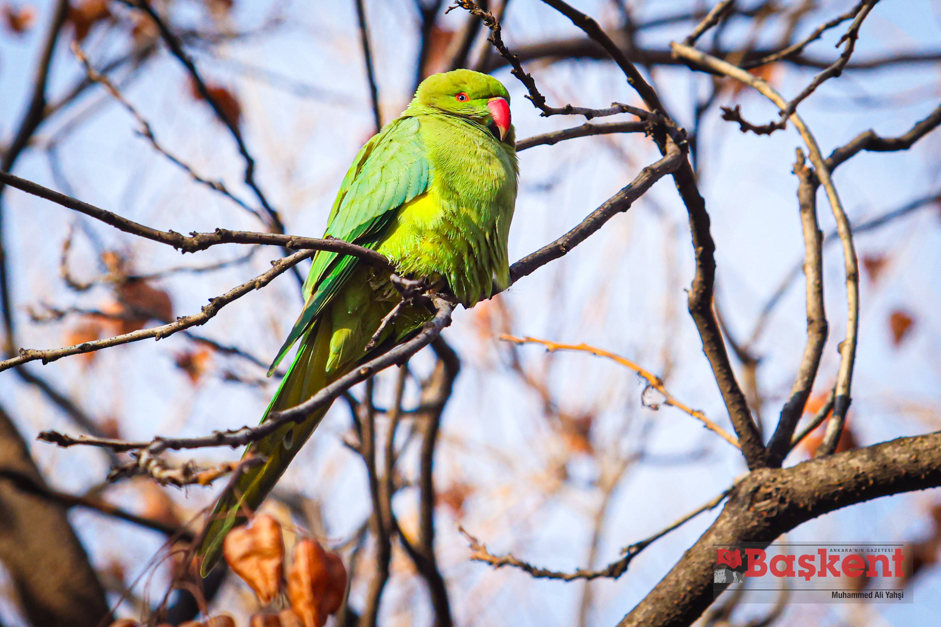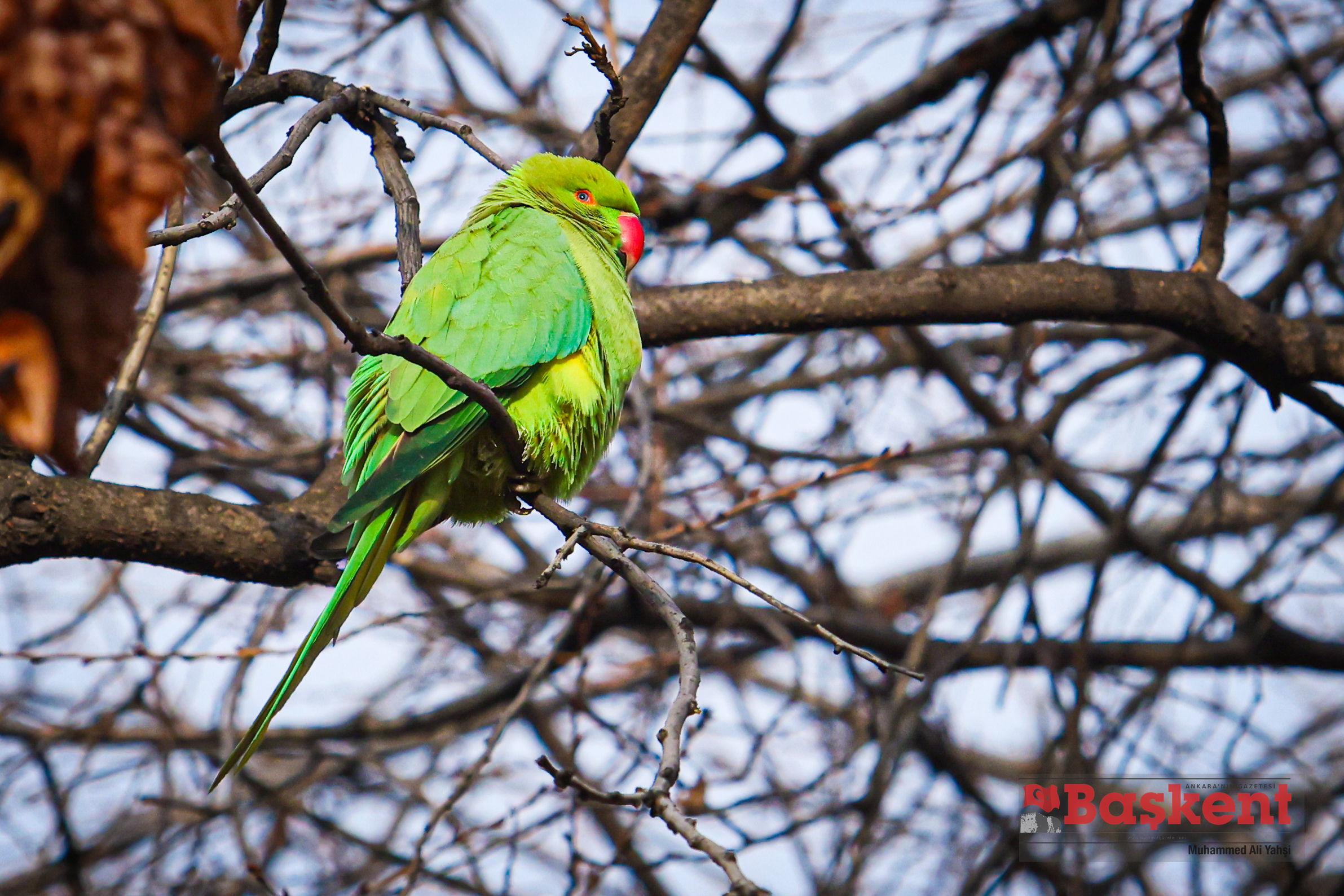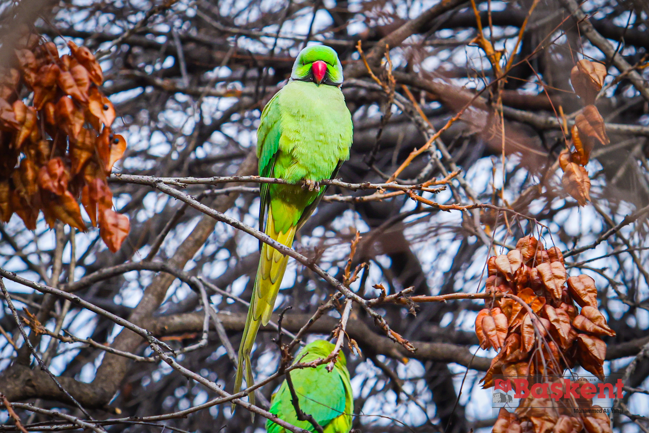 Doğal yaşam alanları Afrika ve Güney Asya olan yeşil papağanlar (Psittacula krameri), Ankara’nın merkezinde yer alan Kurtuluş Parkı’nda objektife yansıdı. Halkalı boyunlu paraket olarak da bilinen bu papağanlar, şehir parklarına uyum sağlayabilen yapılarıyla dikkat çekiyor.