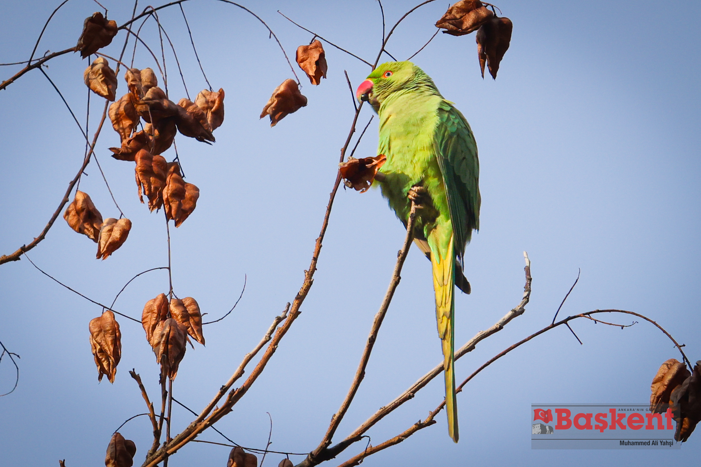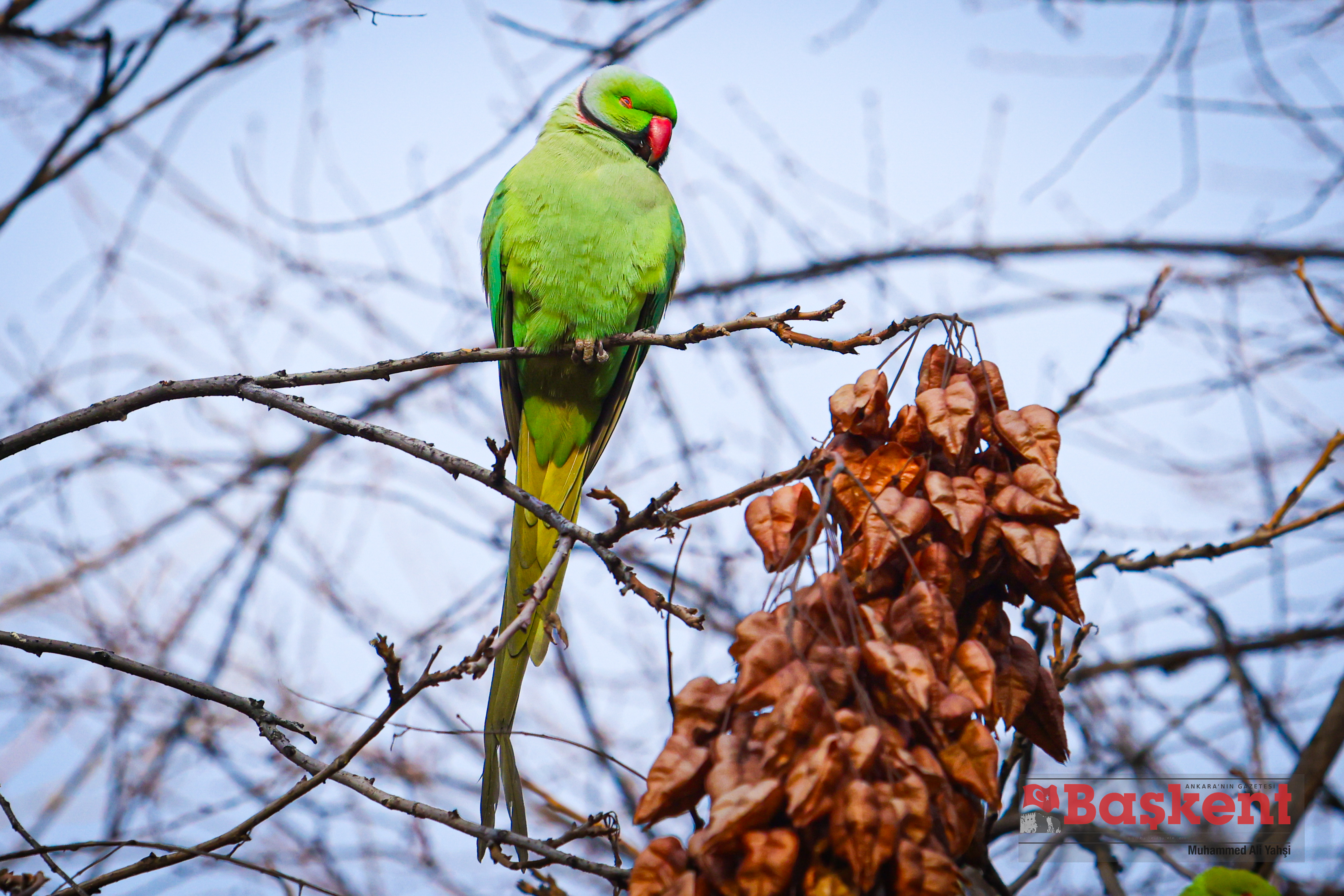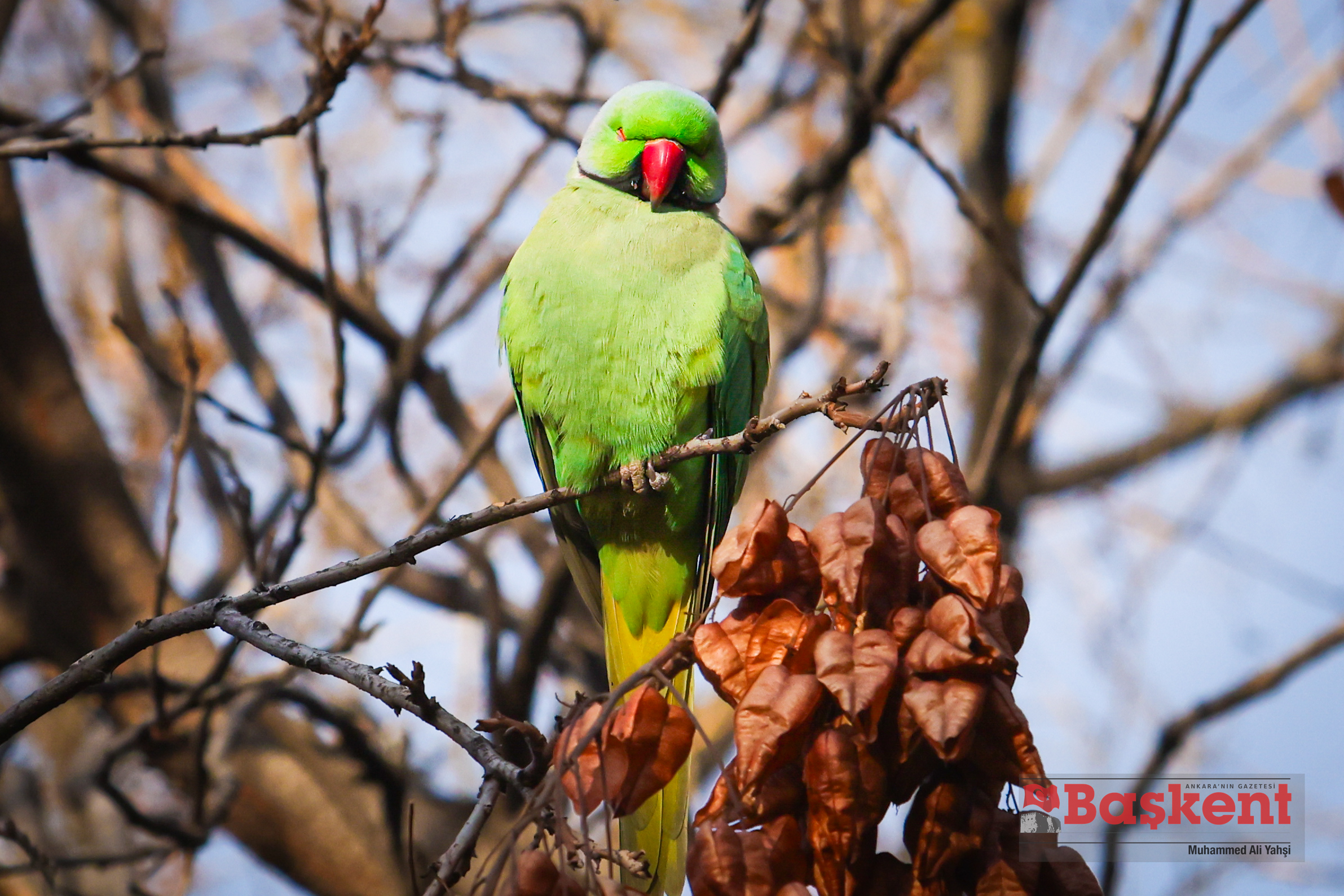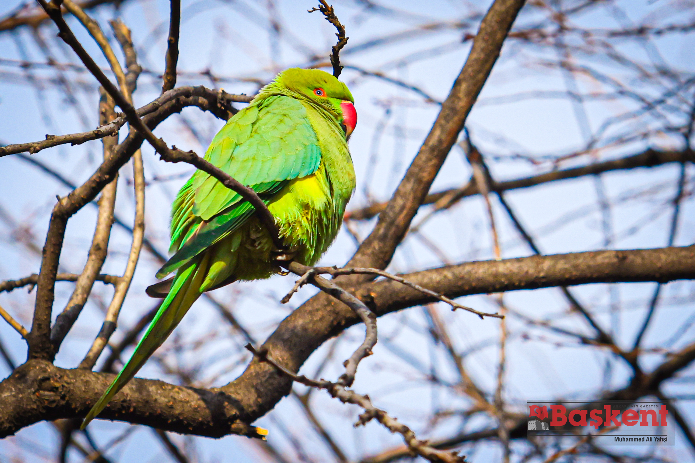 Doğal yaşam alanları Afrika ve Güney Asya olan yeşil papağanlar (Psittacula krameri), Ankara’nın merkezinde yer alan Kurtuluş Parkı’nda objektife yansıdı. Halkalı boyunlu paraket olarak da bilinen bu papağanlar, şehir parklarına uyum sağlayabilen yapılarıyla dikkat çekiyor.