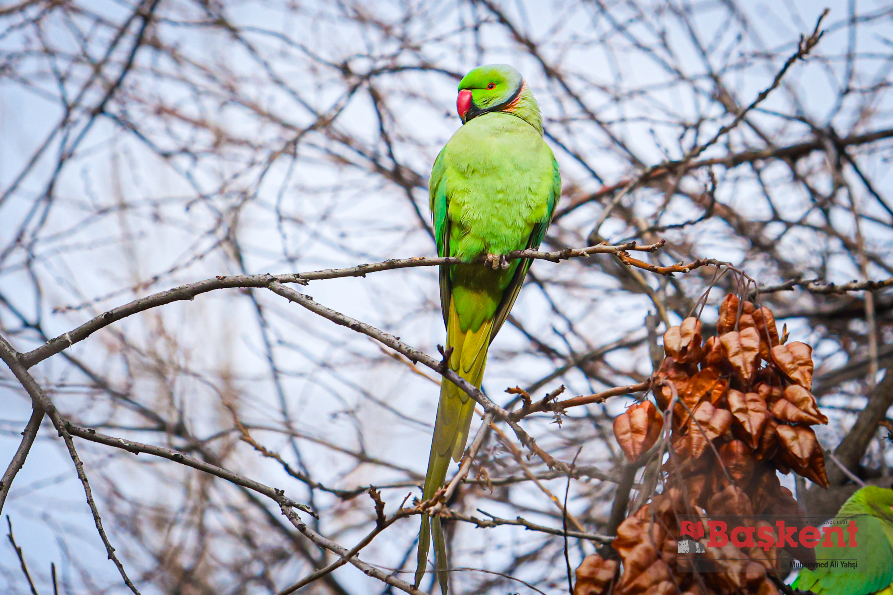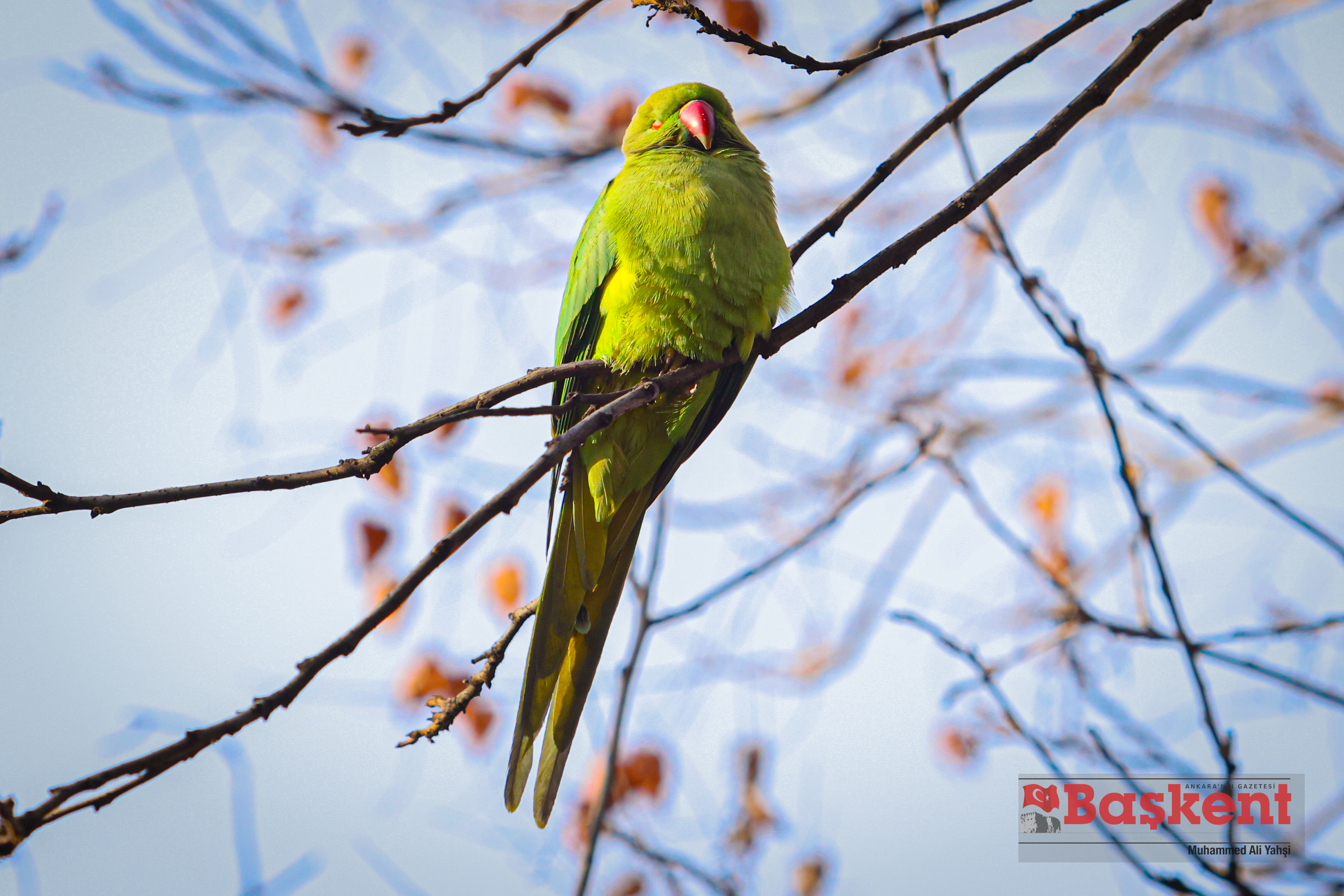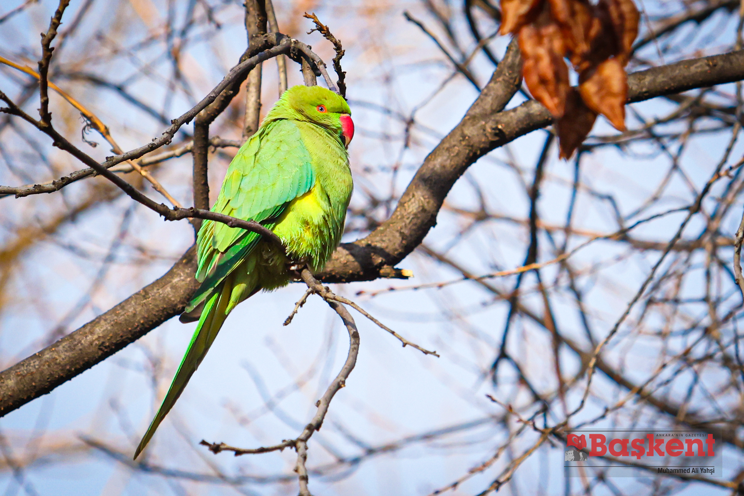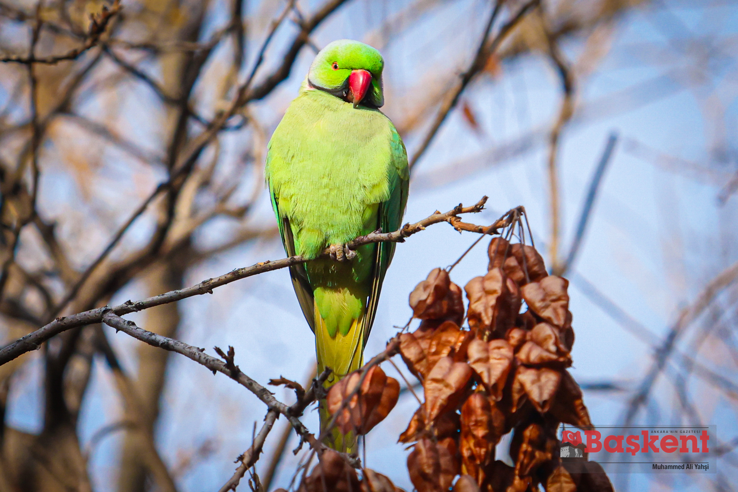 Doğal yaşam alanları Afrika ve Güney Asya olan yeşil papağanlar (Psittacula krameri), Ankara’nın merkezinde yer alan Kurtuluş Parkı’nda objektife yansıdı. Halkalı boyunlu paraket olarak da bilinen bu papağanlar, şehir parklarına uyum sağlayabilen yapılarıyla dikkat çekiyor.