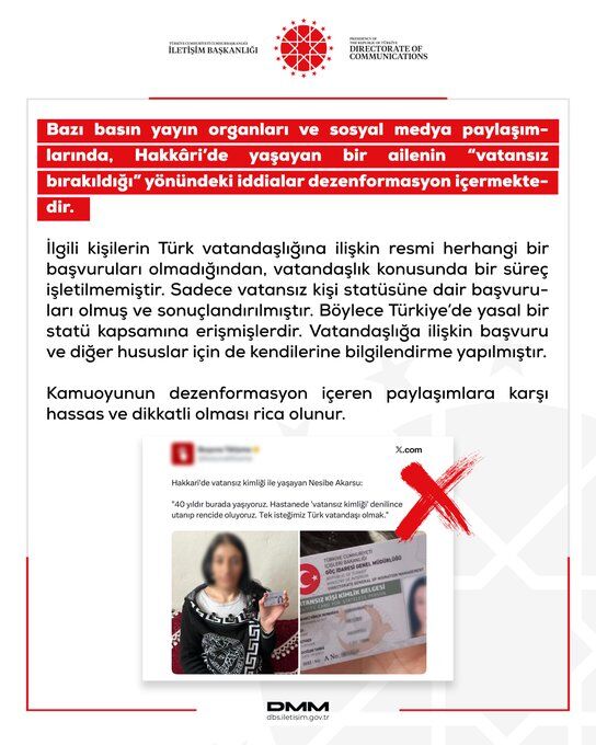 Merkez tarafından yapılan açıklamada, söz konusu kişilerin Türk vatandaşlığına ilişkin resmi herhangi bir başvuruda bulunmadıkları, bu nedenle vatandaşlıkla ilgili bir sürecin işletilmediği belirtildi. Açıklamada, yalnızca “vatansız kişi statüsü” kapsamında başvurularının bulunduğu ve bu başvurunun sonuçlandırıldığı ifade edildi.