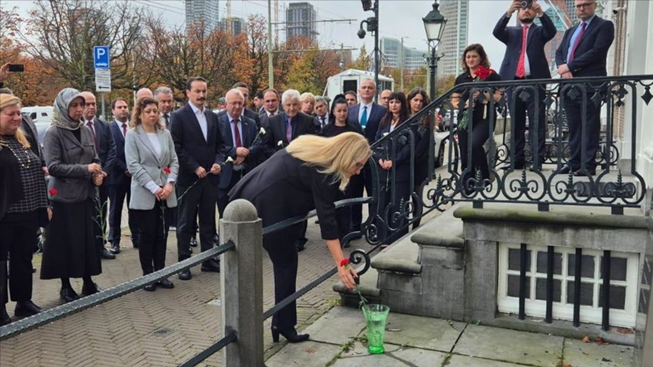 Büyükelçilik mensupları, Lahey Büyükelçiliği duvarındaki şehit Ahmet Benler adına yaptırılan plaketin önüne birer karanfil bıraktı.