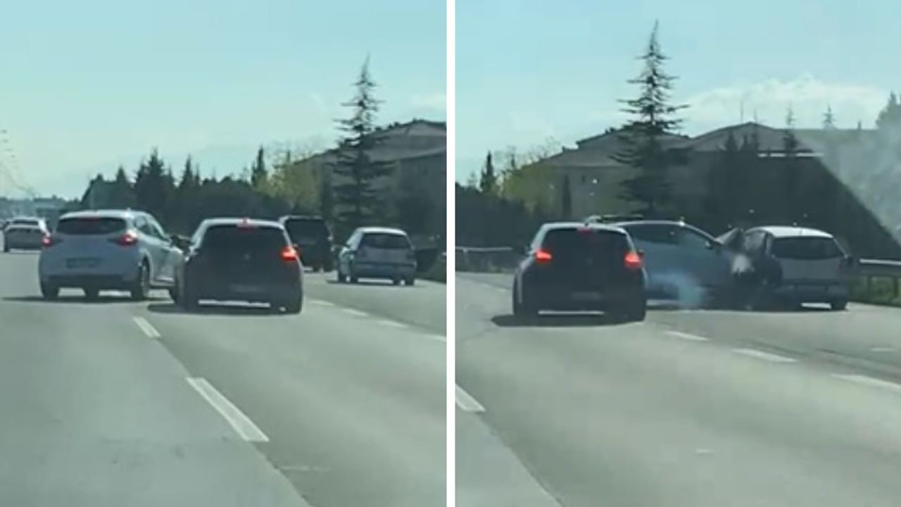 Olay, dün TEM Otoyolu İzmit geçişinin Ankara yönünde meydana geldi. Ankara istikametine giden içerisinde çift ile bebeklerinin olduğu otomobili, aynı yönde giden başka bir otomobilin sürücüsü sıkıştırdı. Sıkıştırılan çift hem kendilerini hem de trafiği tehlikeye sokan otomobil sürücüsünü, cep telefonuyla görüntüledi. Tehlikeli şekilde ilerleyip, bir süre makas atan sürücüsünün kullandığı otomobil, bebek ile çiftin bulunduğu otomobile ardından başka araca çarptı. Olay cep telefonu kamerasına yansırken, Y.G. ve F.S. hakkında 'Trafik güvenliğini tehlikeye sokmak' suçundan işlem yapıldı.