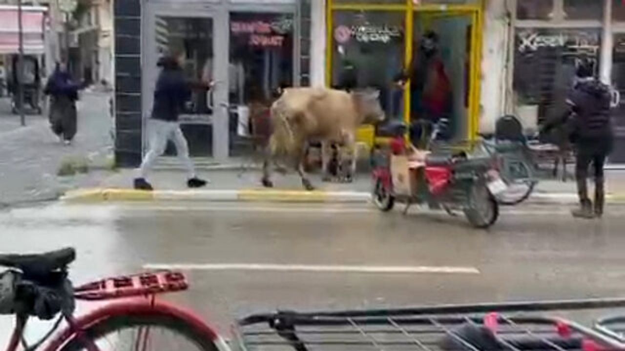 Bolvadin'de dün öğle saatlerinde sahibinin elinden kaçan inek çarşı merkezinde bir süre başıboş dolaştıktan sonra berber dükkanı ile çay ocağının kapısından içeri girmeye çalıştı. Çay ocağı işletmecisi Hakan Aktepe'nin, kapıdan uzanıp ipini tuttuğu inek güçlükle yakalandı. İnek daha sonra sahibi tarafından götürüldü. Çevredekilerin şaşkınlıkla takip ettiği olay cep telefonuyla görüntülendi.