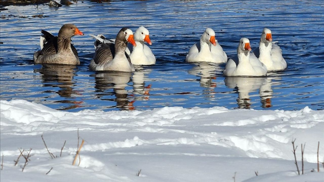 Gece hava sıcaklığının sıfırın altında 14 dereceye düştüğü ilçede bazı dereler kısmen, bazıları da tamamen buzla kaplandı. Yağbasan köyünde damızlık olarak beslenen kazlar, güneşin açmasıyla köy içinden geçen dereye girerek buz tutmayan kısımda yüzdü.