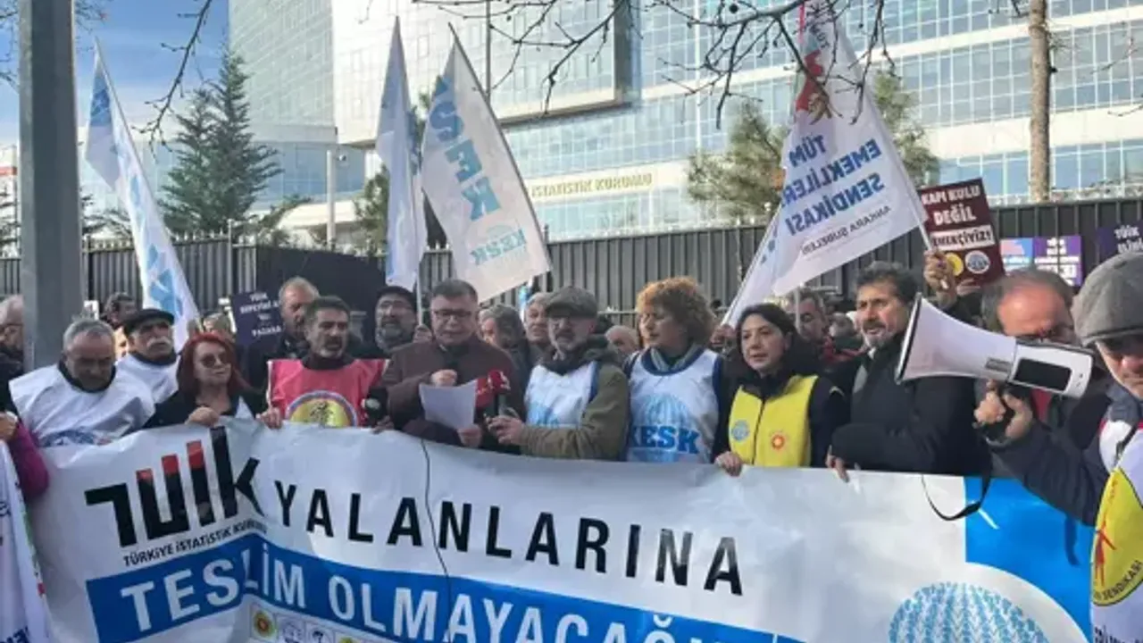 KESK üyesi yaklaşık 100 kişi, bugün açıklanan enflasyon verilerini protesto etmek için TÜİK önünde bir araya geldi. 'TÜİK'in yalanlarına teslim olmayacağız' yazılı pankart açan grup üyeleri, kandil yakıp, gökyüzüne siyah balon bıraktı. KESK Eş Genel Başkanı Ahmet Karagöz, "Gözümüzü; iğneden ipliğe her şeye yapılan zam fırtınası ile açtığımız bir yılı, 2025 yılını geride bıraktık. Yıllardır devam eden yoksullaştırma politikalarından 4 milyon kamu emekçisi ve 2,5 milyon kamu emeklisi olarak bizler de payımıza düşeni aldık. 2025 yılı asgari ücretlisinden emeklisine, işçisinden kamu emekçisine kadar emeği ile geçinen milyonlar için, bizler için adeta bir kabus yılı oldu. Maaşlarımız her ay gittikçe erirken yoksulluğumuz günden güne arttı. Evet, 2025 yılını geride bıraktık. Ama sorunlarımız artarak devam ediyor. Ülkeyi yönetenler yıllardır çarşıda, pazarda, mutfakta yaşadığımız gerçek enflasyonun yarısına bile denk gelmeyen suni verileri resmi enflasyon olarak açıkladılar. Maaş artışlarımızı TÜİK’in bu sahte verileri ile sınırladılar. Böylece bu ülkenin ezici çoğunluğunu oluşturan bizleri, emeği ile geçim mücadelesi veren milyonları her geçen gün daha fazla yoksullaştırdılar, sefalete ittiler. 6'şar aylık bu artışlar daha ilk bir-iki ayda TÜİK’in sahte enflasyonunun bile altında kaldı. Aylarca enflasyon farkı almak için bekledik. 6'şar aylık periyotlarla hep aynı şeyi yaşamaya devam ettik. Böylece sadece son 2 yılda maaşlarımız yüzde 20 eridi" ifadelerini kullandı.