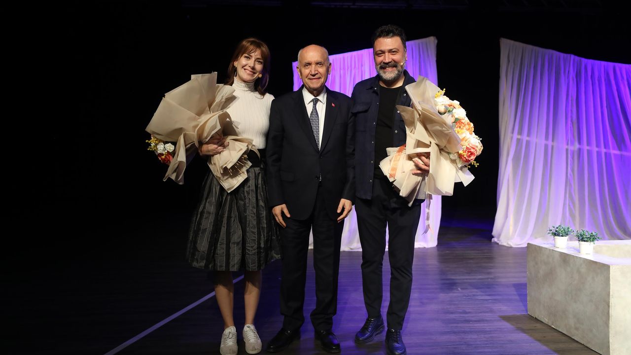 Oyun sonunda Başkan Fethi Yaşar sahneye çıkarak oyunculara çiçek takdim etti.