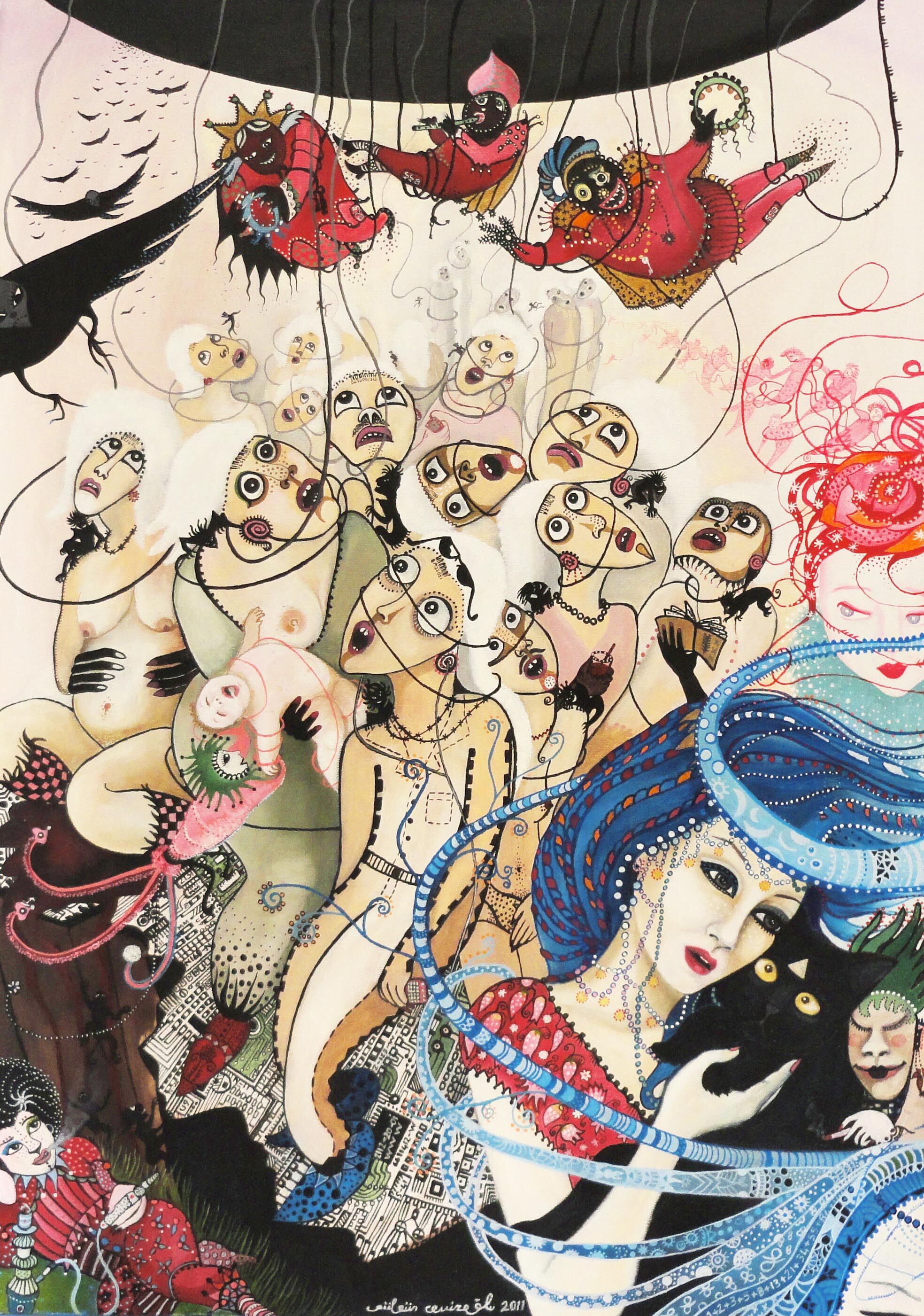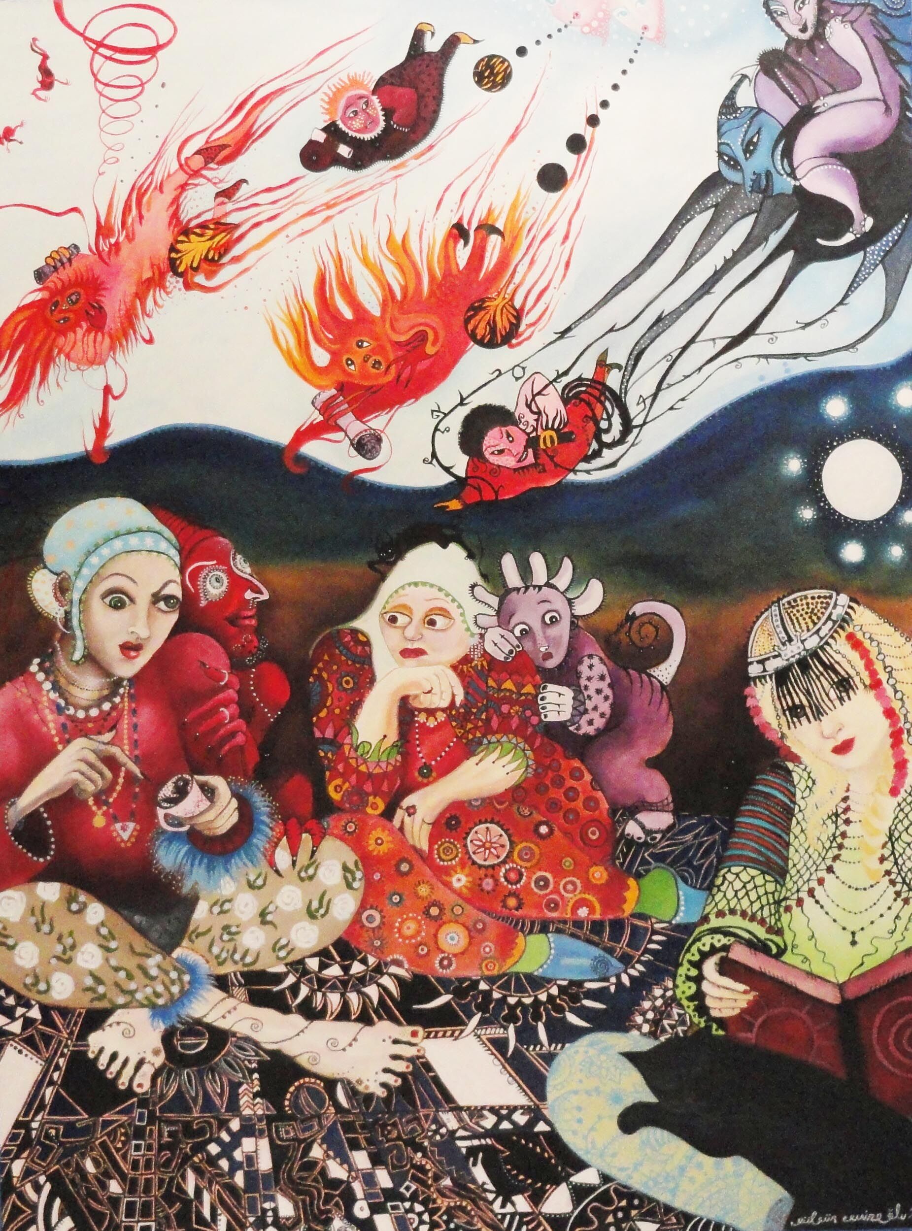 Çünkü; kendi hikayemi ve hayatımı resmediyorum. Resimlerde bir başrol oyuncusu var... Babam, Hasanoğlan Köy Ensitüsü'nün ilk mezunlarındandı. Eğitmen bir babanın çocuğuyum. Babam, çocukluğumda bize hep masallar anlatırdı. Masallara ve hikayelere olan ilgimin nedeni babam... Babam Anadolu masallarını kulağımıza fısıldardı. O fısıltılar resme dönüşüyor. Belki bir gün babamın anlattığı masalları bir kitapta toparlayabilirim. Elektrik kesildiğinde babam gaz lambasını yakardı. 5 kardeş babamın etrafında toparlanır onun sihirli sözcüklerini dinlerdik. Elektrik gelince çok üzülürdük.