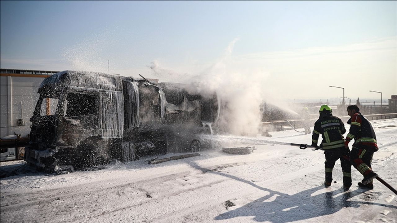 Ebubekir Güven idaresindeki 26 VF 647 plakalı akaryakıt yüklü tanker, Mersin-Adana Otoyolu, Mersin Serbest Bölgesi bağlantı yolunda alev aldı.