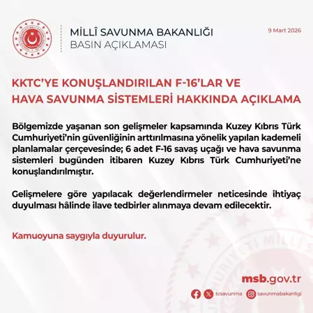 Bakanlıktan yapılan yazılı açıklamada, "Bölgemizde yaşanan son gelişmeler kapsamında KKTC’nin güvenliğinin artırılmasına yönelik yapılan kademeli planlamalar çerçevesinde; 6 adet F-16 savaş uçağı ve hava savunma sistemleri bugünden itibaren KKTC’ye konuşlandırılmıştır. Gelişmelere göre yapılacak değerlendirmeler neticesinde ihtiyaç duyulması halinde ilave tedbirler alınmaya devam edilecektir" ifadelerine yer verildi.