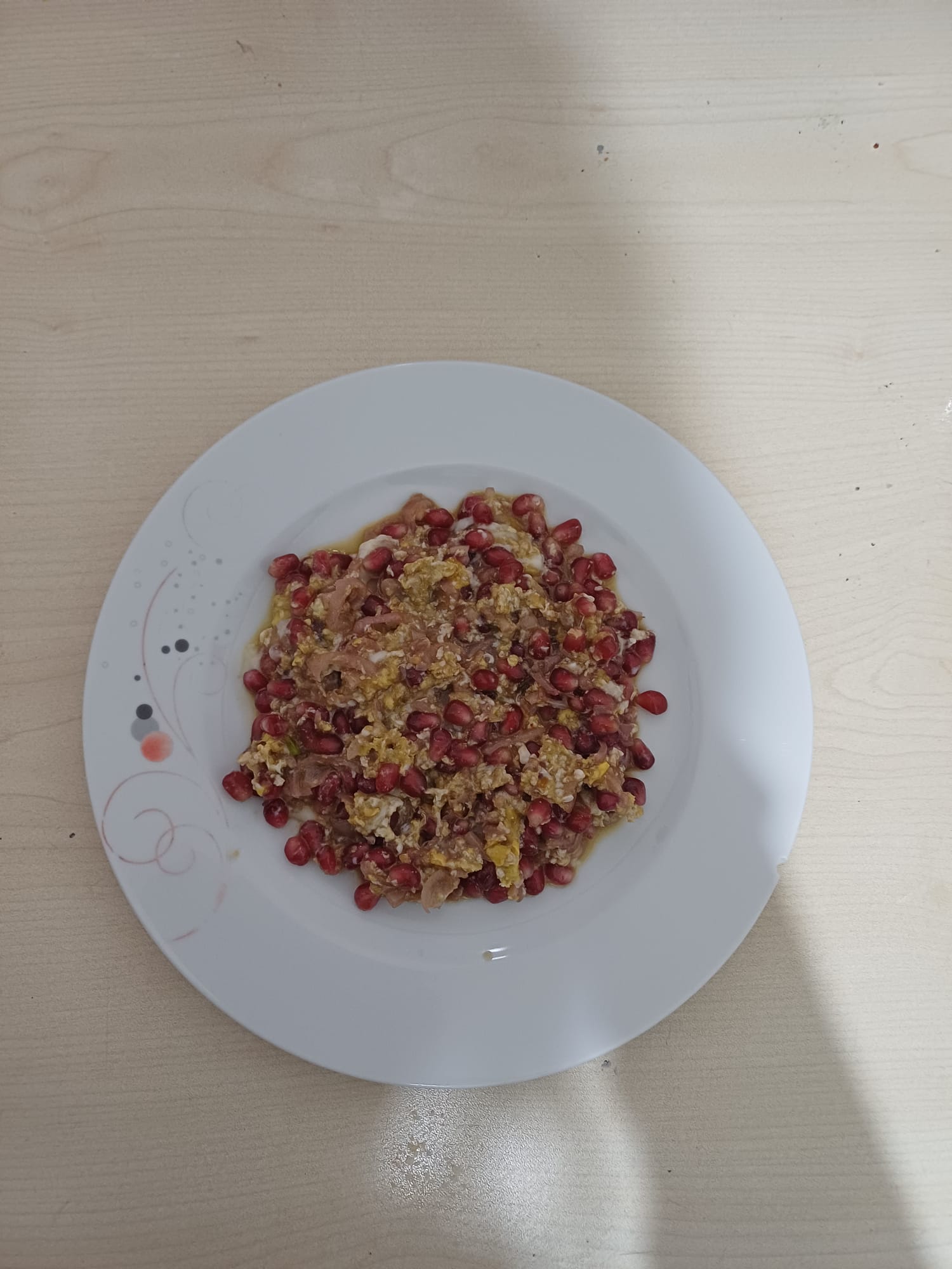 Tavaya tereyağı ve sıvı yağı alıp ısıtın. Minik doğranmış soğanları ekleyerek pembeleşene kadar kavurun. Ayıklanmış nar tanelerini ilave edip 2–3 dakika birlikte soteleyin. Kaşıkla boşluk açarak yumurtaları kırın, tuz ekleyin ve tavanın kapağını kapatın. Yumurtalar kısık ateşte piştikten sonra sıcak olarak servis edin.