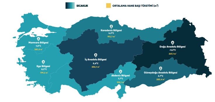 Verilerin ilginç tarafı ise 2026 yılı Ocak ortalama sıcaklığı, uzun yıllar ortalama sıcaklığın 0,7°C üstünde gerçekleşerek 3,6°C olması. Bu nedenle, 2025 yılı Ocak ayına göre daha sıcak olan 2026 ocak ayında ortalama hane başı tüketimi 176 m3’ten 199 m3’e çıktı.