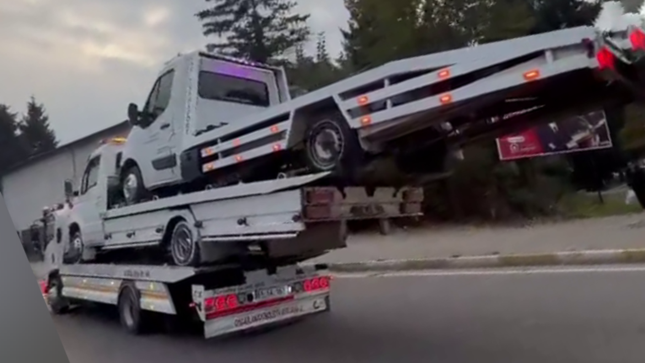 Kervan Mahallesi’nde sürücüsünün, oto kurtarıcı aracının üzerine yüklenen 2 oto kurtarıcıyla ilerlediği anlar, çevredekilerin cep telefonuyla kaydedildi. Görüntüler, sosyal medyada paylaşıldı. Polis ekiplerinin sürücünün tespiti için çalışma yaptığı öğrenildi.