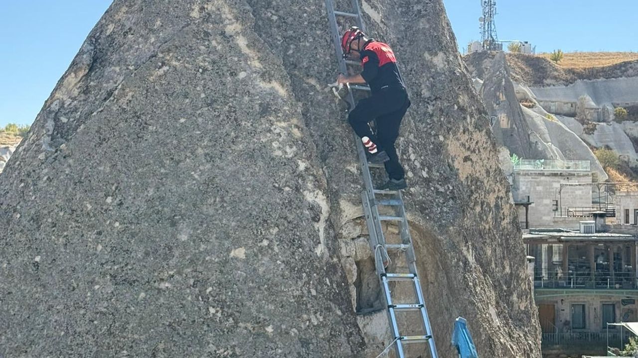 Göreme beldesinde yaklaşık 10 metre yükseklikteki peribacasının tepe noktasına çıkan bir kedi, bir süre sonra bulunduğu yerden inemedi. Durumu gören vatandaşlar 112 Acil Çağrı Merkezi’ne haber verdi. İhbar üzerine bölgeye Ürgüp Belediyesi itfaiye ekipleri sevk edildi. Ekipler, peribacasına kurdukları merdivenden uzattıkları bir aparat yardımıyla kediyi yakalamayı başardı. İtfaiye tarafından kurtarılan kedinin herhangi bir sağlık sorunu olmaması üzerine salıverildi. İndirilen kedi hemen gözden kayboldu.