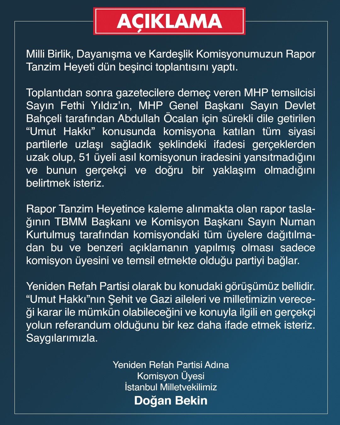 “Rapor Tanzim Heyetince kaleme alınmakta olan rapor taslağının TBMM Başkanı Sayın Numan Kurtulmuş tarafından komisyondaki tüm üyelere dağıtılmadan bu ve benzeri açıklamanın yapılmış olması sadece komisyon üyesini ve temsil etmekte olduğu partiyi bağlar.