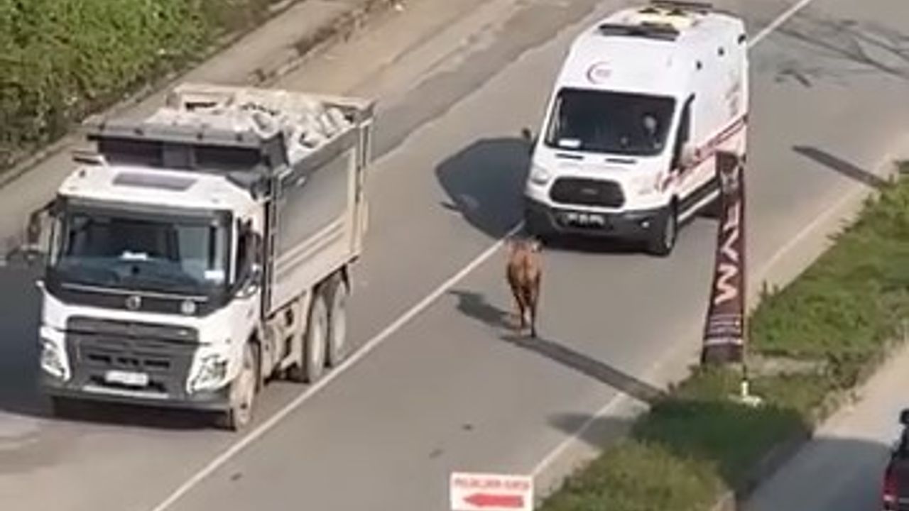Pazar ilçesinde sahibinin elinden kaçan inek, caddeye çıktı. Bir süre caddede başıboş dolaşan inek, sürücülere zor anlar yaşattı. O anlar, vatandaşlar tarafından görüntülendi. Görüntüde ineğin trafikte başıboş halde dolaşıp, karşı yöne geçtiği anlar yer aldı.
