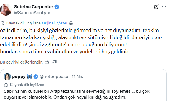 Coachella performansı sırasında zılgıt çeken bir hayranına söyledikleri yüzünden tepki alan Sabrina Carpenter, X hesabından yaptığı paylaşımla özür diledi.