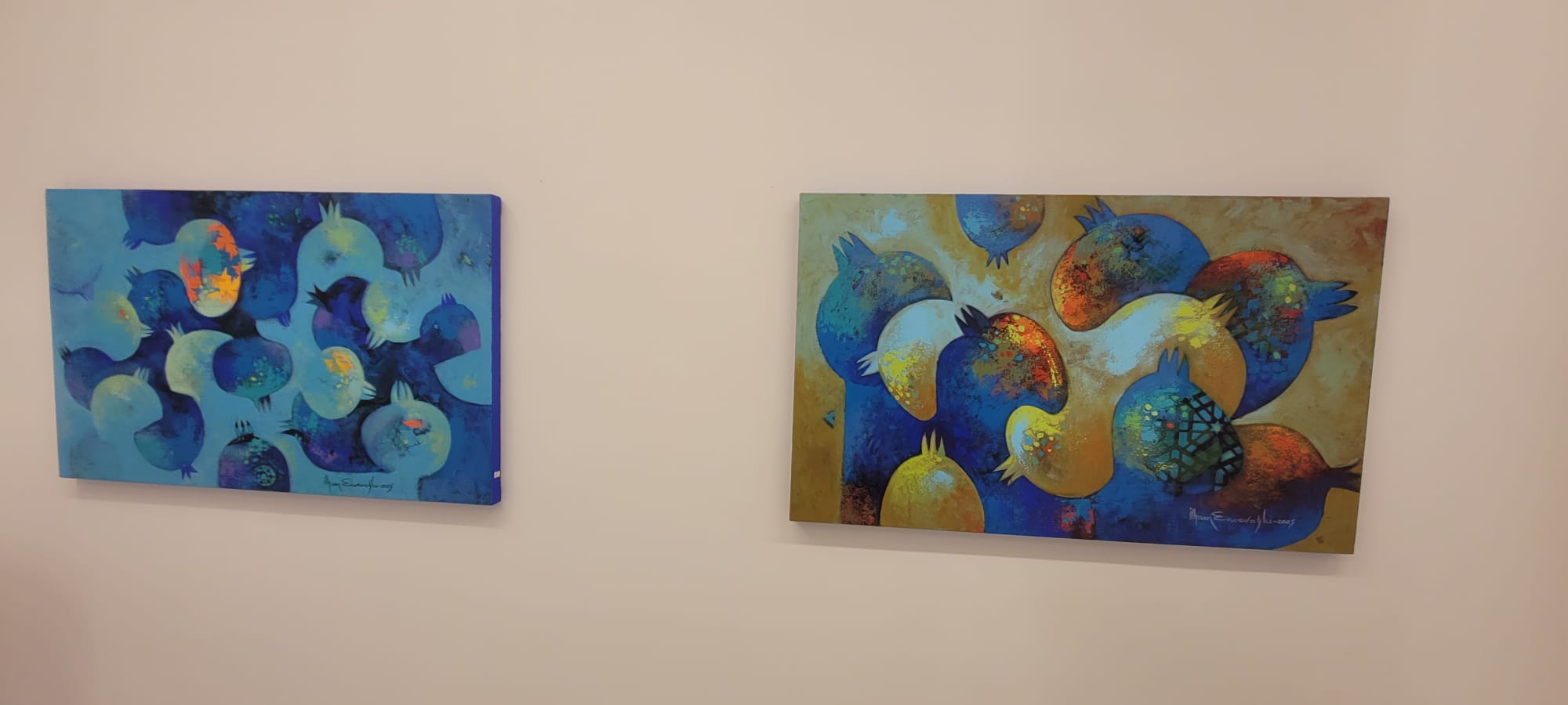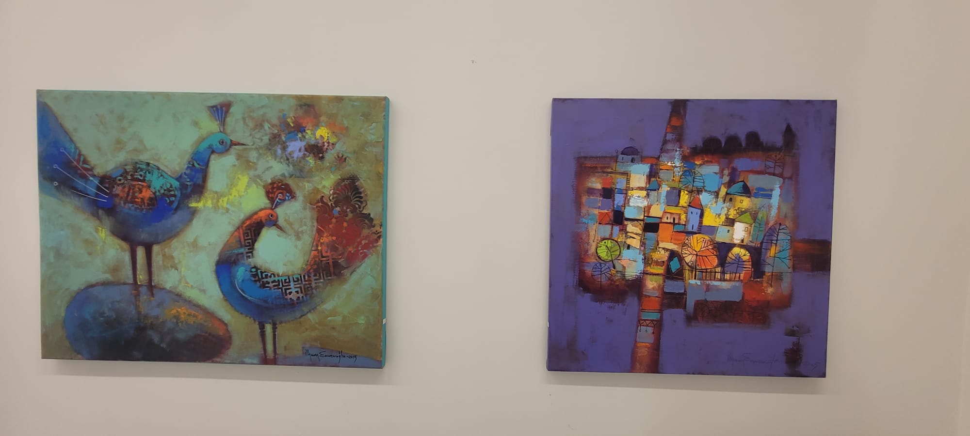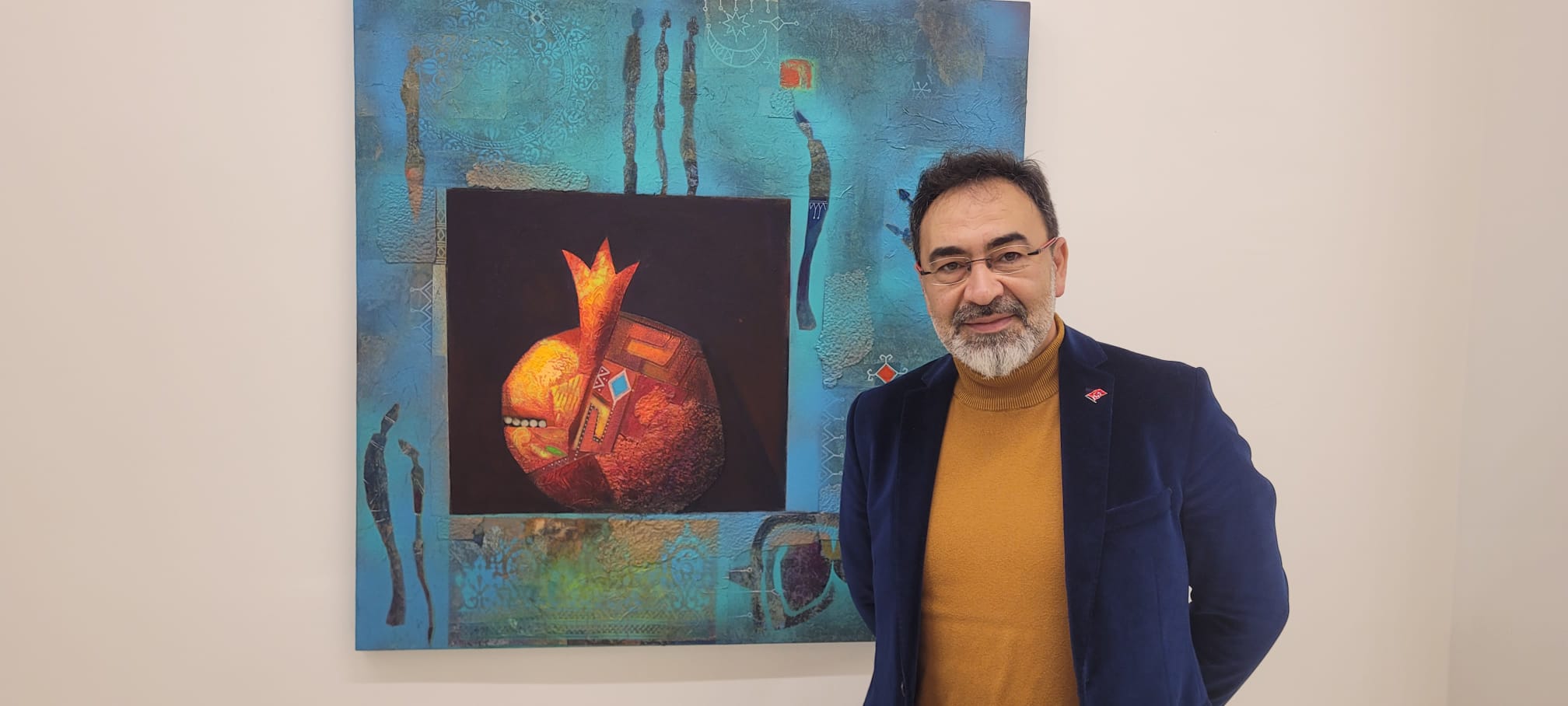 Enveroğlu’nun resimlerinde yer alan kuş, el ve insan figürleri gibi sembollerin manevi ve kültürel anlamlar taşıyor. Bu semboller hem geçmişe ait kültürel mirasın bir parçası olarak hem de modern sanatın dinamikleriyle yeniden yorumlanmış olarak karşımıza çıkıyor.