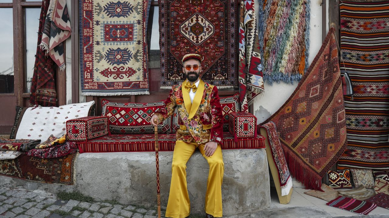 Ankara'da yaşayan 34 yaşındaki terzi Ziya Pınarbaşı, geleneksel işlemeli battaniye, kilim, halı ve perdelerden dönüştürerek tasarladığı kıyafetleri giyerek, Başkent sokaklarında sergiliyor.