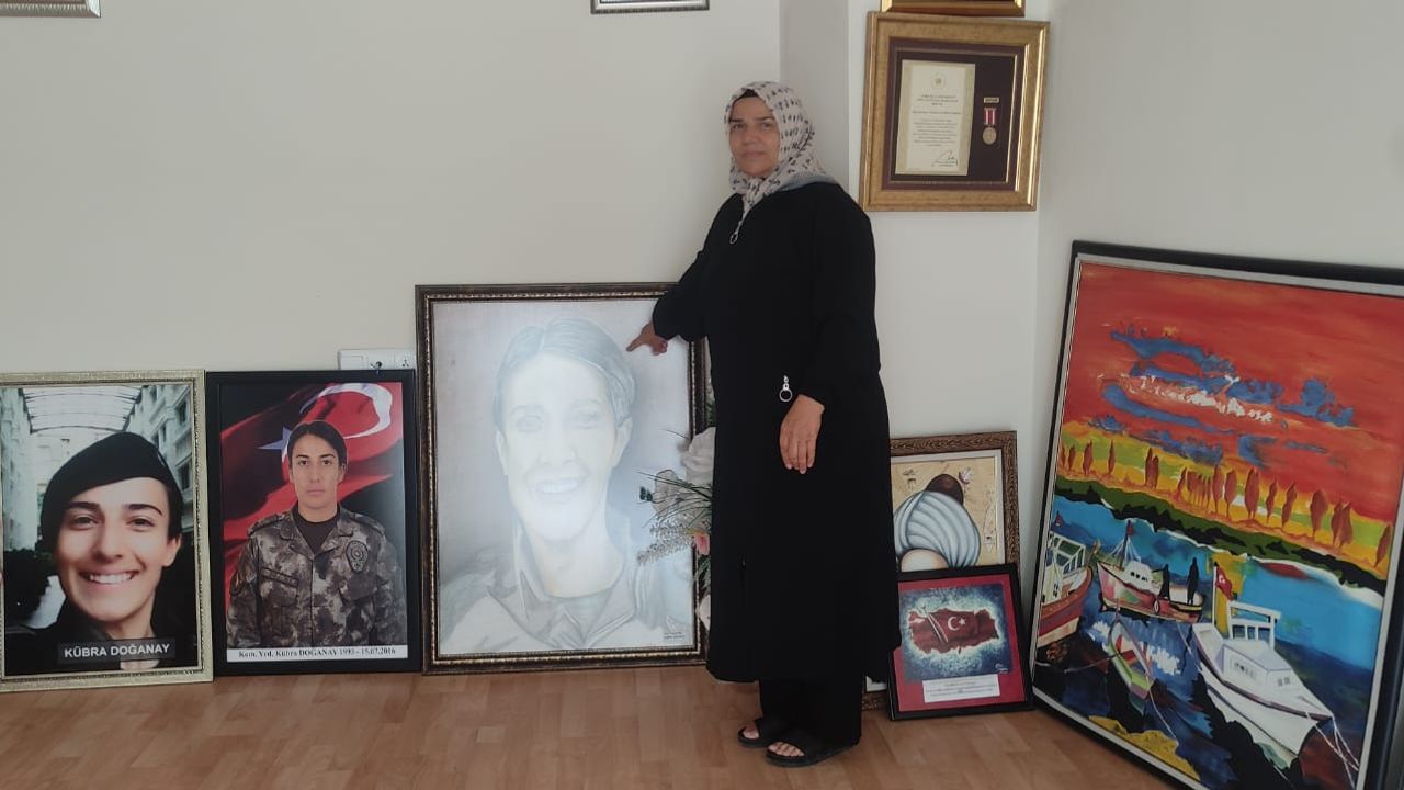 FETÖ/PDY'nin 15 Temmuz 2016'daki darbe girişiminde bombalanan Ankara Gölbaşı'ndaki Polis Özel Harekat Daire Başkanlığı'nda komiser yardımcısı Kübra Doğanay da şehit oldu. Şehit Doğanay'ın Kayseri'de yaşayan annesi Hikmet ve babası Harun Doğanay, kızlarının hatırasını yaşatıyor. Doğanay çifti, evin bir odasını kızlarının fotoğraflarıyla donattı.