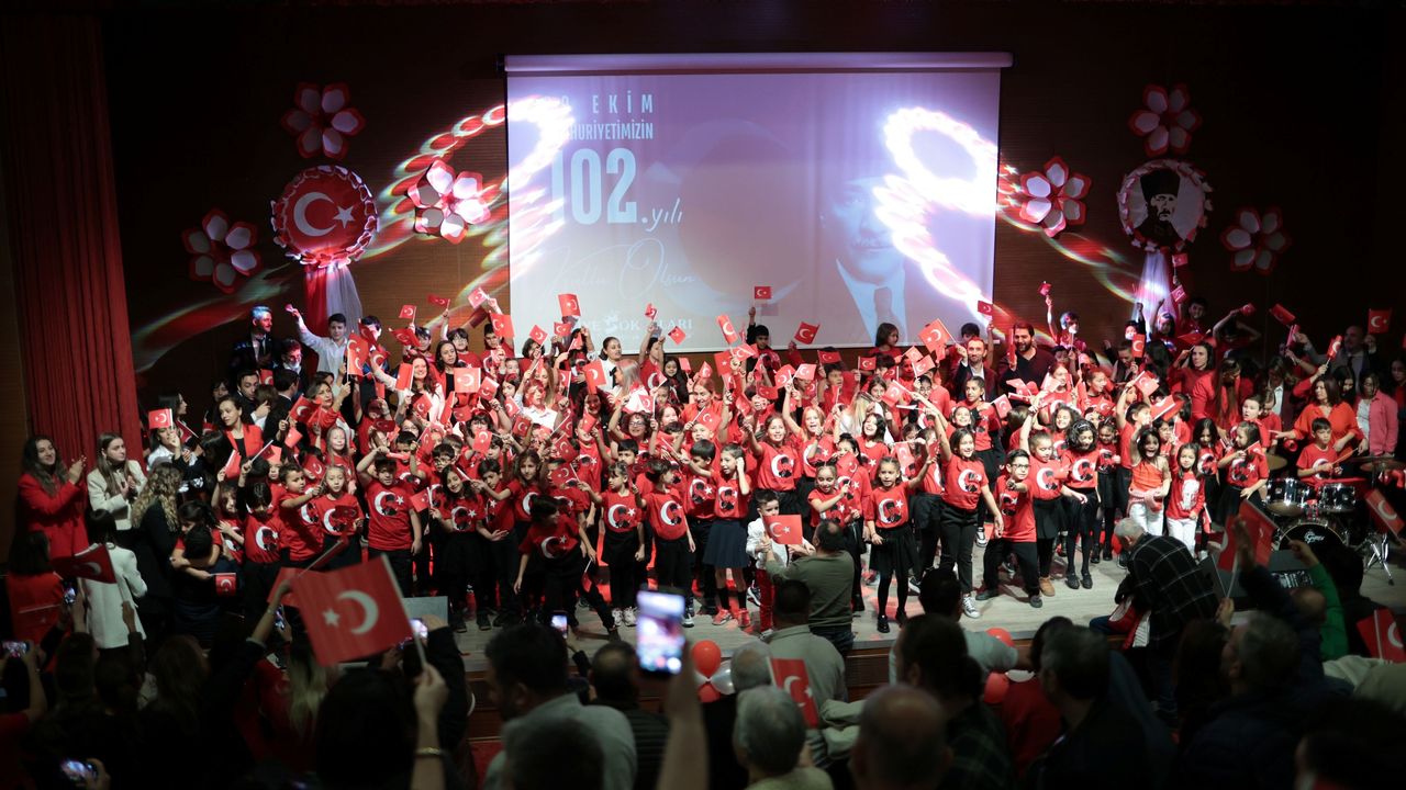 Törenin sonunda tüm öğrenciler kırmızı beyaz bayraklarla sahnede bir araya gelerek, Cumhuriyet’in 102. yılında Atatürk’ün izinde ilerleme kararlılıklarını bir kez daha dile getirdi.