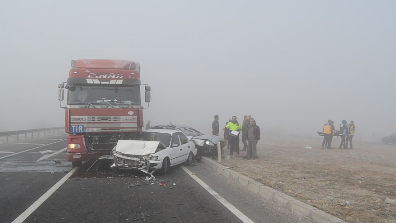 Kaza, saat 10.00 sıralarında Aksaray-Konya kara yolu Ticaret Borsası Kavşağı'nda meydana geldi. Yoğun sis nedeniyle görüş mesafesinin 20 metreye kadar düştüğü bölgede, Atanur Korkmaz yönetimindeki 38 LG 620 plakalı TIR, kırmızı ışıkta duran 3 otomobil ile 1 hafif ticari araca çarptı. Kazada 40 AAS 714 plakalı araçta bulanan Gizem Şahin (26) yaralandı. İhbarla bölgeye sağlık ve polisi ekibi sevk edildi. Yaralı Şahin, ambulansla Aksaray Eğitim ve Araştırma Hastanesi'ne kaldırıldı.