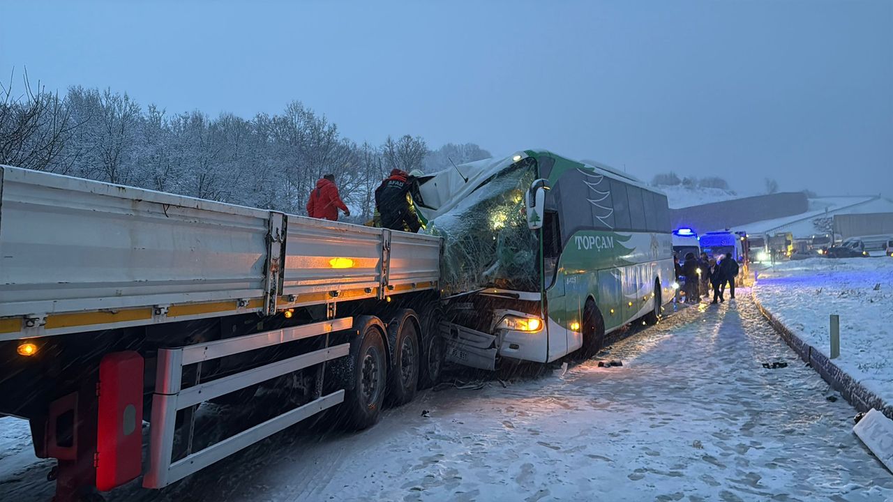 Kaza, Tokat– Sivas kara yolunun Kızıl İniş mevkisinde meydana geldi. Sivas istikametine seyir halinde olan Topcan firmasına ait 60 BD 891 plakalı yolcu otobüsü, karla kaplı yolda aynı yönde ilerleyen İsa Şahin idaresindeki 55 BLC 53 plakalı TIR’a arkadan çarptı. Çarpmanın etkisiyle otobüste bulunan 7 yolcu yaralandı. İhbar üzerine bölgeye AFAD, itfaiye ve çok sayıda ambulans sevk edildi. Otobüste sıkışan yaralı yolcular, itfaiye ve AFAD ekiplerinin çalışmasıyla bulundukları yerden çıkarıldı. Yaralılar olay yerinde yapılan ilk müdahalenin ardından çevredeki hastanelere kaldırıldı.