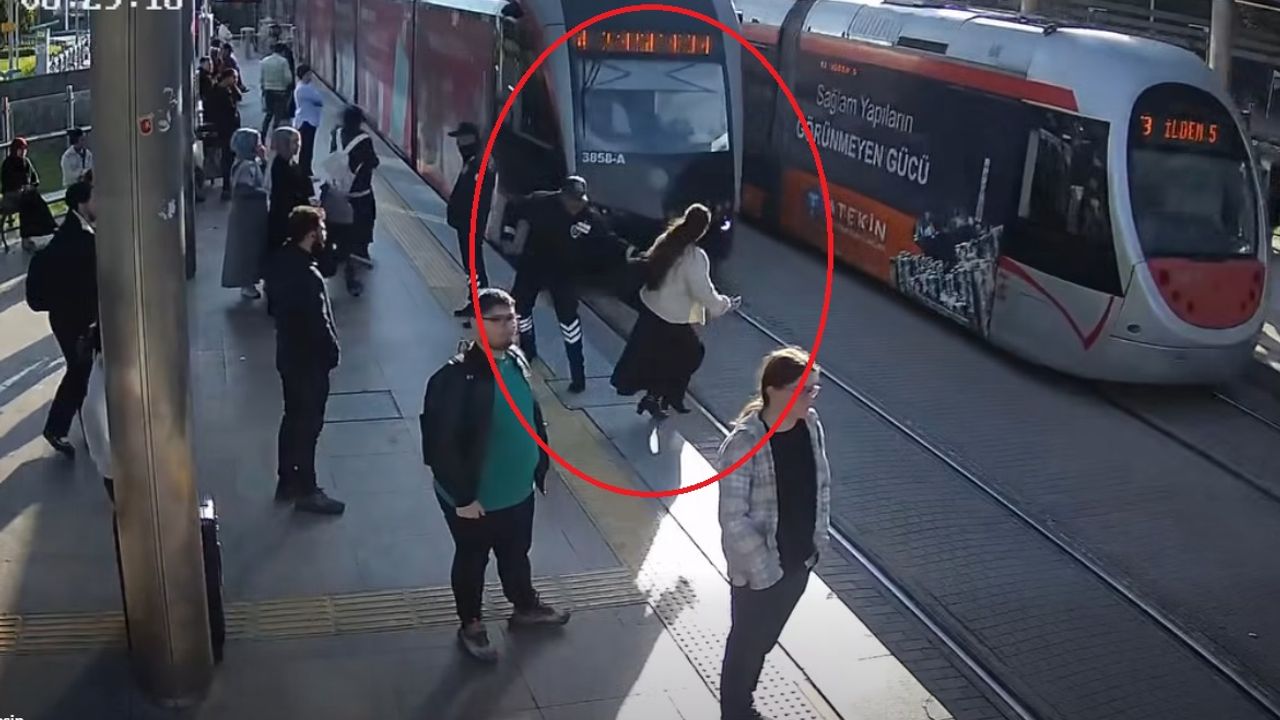 Olay, saat 08.30 sıralarında Cumhuriyet Meydanı tramvay durağında meydana geldi. Kulağında kulaklık, tramvayı fark etmeyip yolun karşısına geçmeye çalışan kadın yolcuyu güvenlik görevlisi kurtardı. O anlar güvenlik kamerasına yansıdı. Görüntülerde, yayanın kendisini kurtaran güvenlik görevlisinden özür dilediği duyuldu.