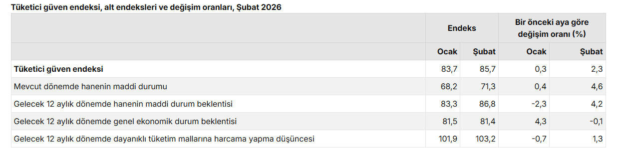 Ocak ayında 83,7 olarak ölçülen endeks, şubatta yüzde 2,3 oranında yükselerek 85,7 seviyesine çıktı. Veriler, tüketicilerin genel ekonomik beklentilerinde sınırlı da olsa iyileşme yaşandığına işaret etti.