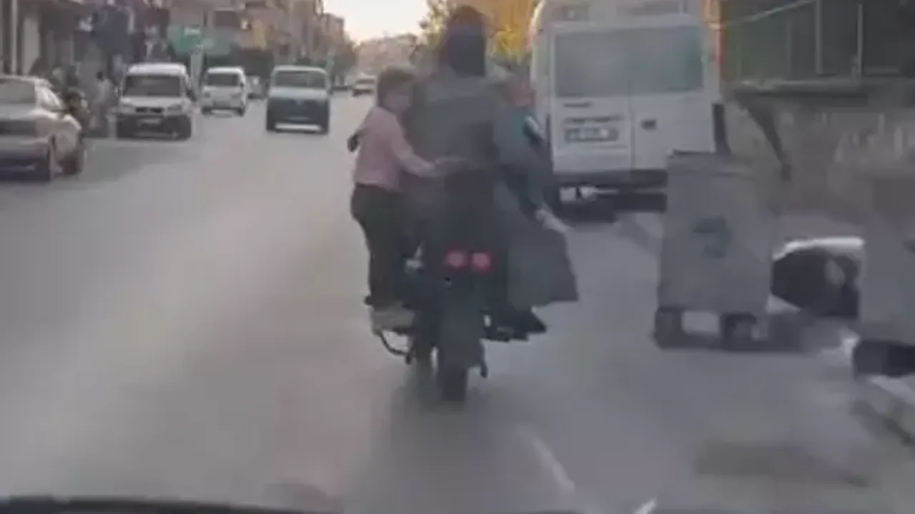Adana'da 5 kişinin bindiği motosiklette çocuklardan biri pedala basarak, diğer ikisi ise anne ve babalarının kucağında yolculuk yaptı. Tehlikeli yolculuk, trafikteki bir kişi tarafından cep telefonuyla görüntülendi.